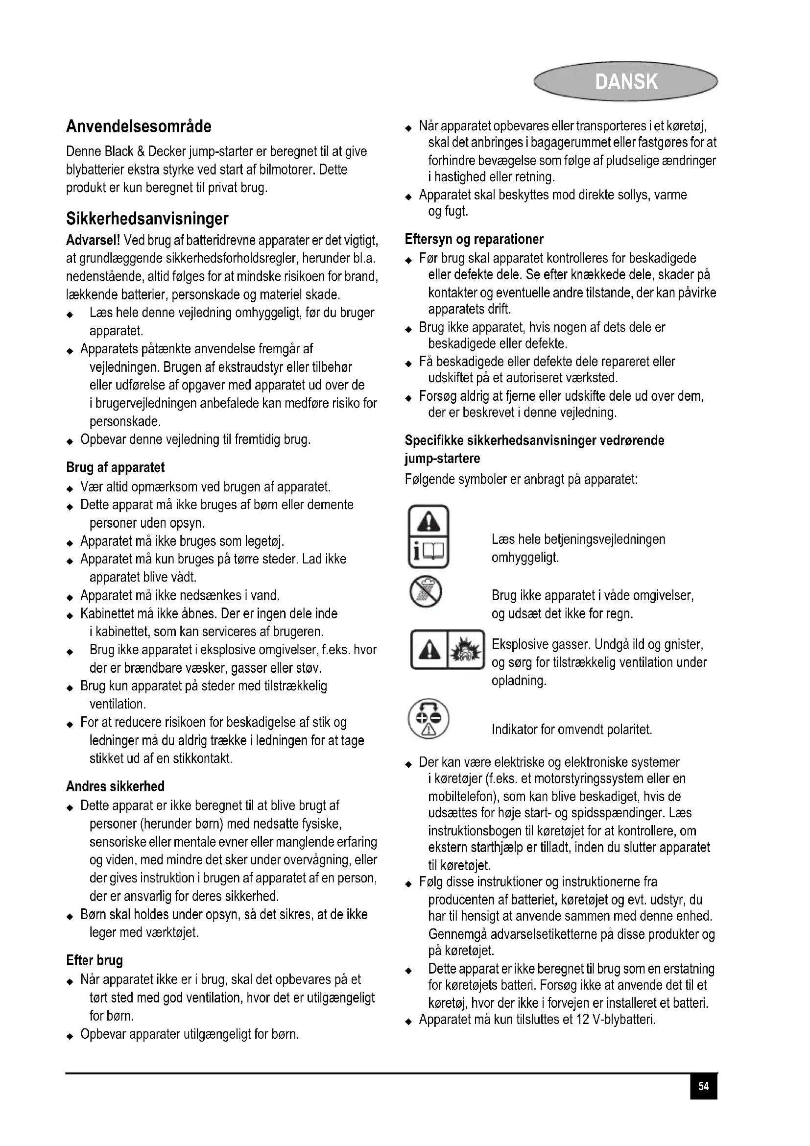 Denne Black & Decker jump-starter er beregnet til at give blybatterier ekstra styrke ved start af bilmotorer. Dette produkt er kun beregnet til privat brug.