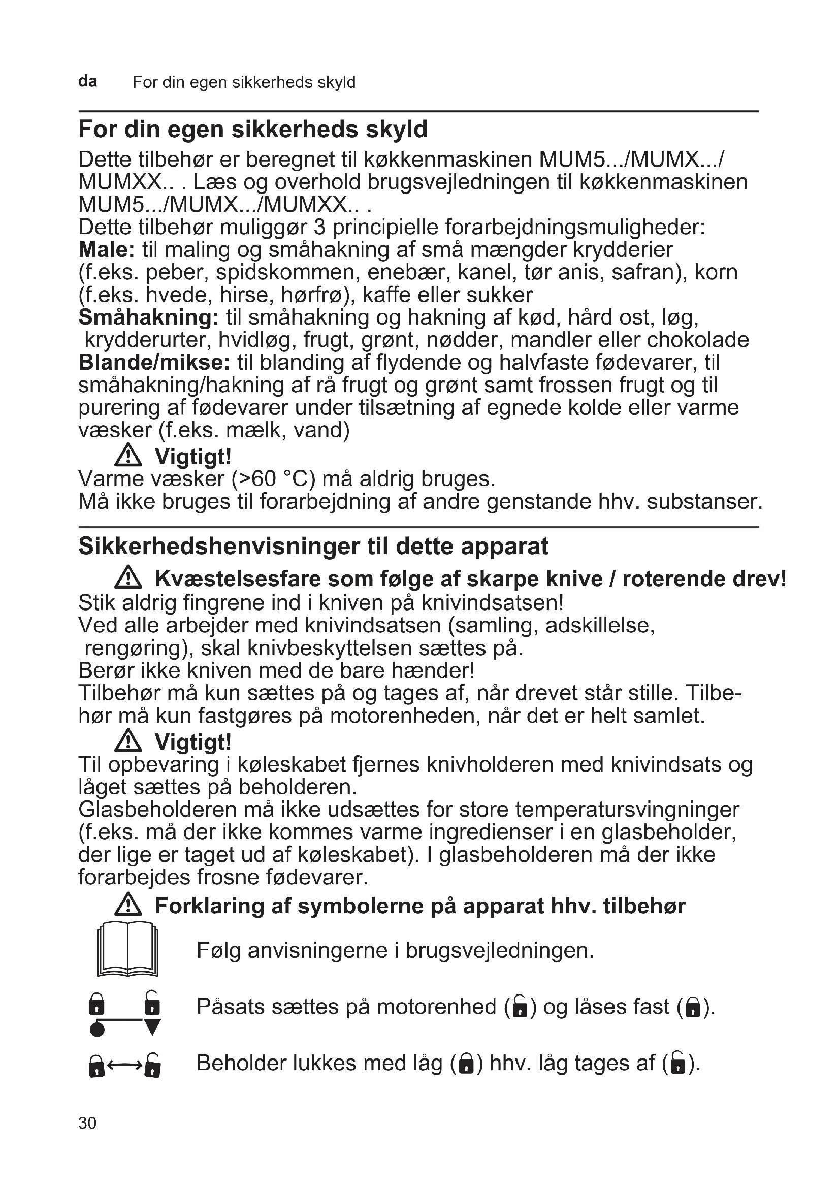 For din egen sikkerheds skyld Dette tilbehør er beregnet til køkkenmaskinen MUM5.../MUMX.../ MUMXX.. . Læs og overhold brugsvejledningen til køkkenmaskinen MUM5.../MUMX.../MUMXX.. . Dette tilbehør muliggør 3 principielle forarbejdningsmuligheder: Male: til maling og småhakning af små mængder krydderier (f.eks. peber, spidskommen, enebær, kanel, tør anis, safran), korn (f.eks. hvede, hirse, hørfrø), kaffe eller sukker Småhakning: til småhakning og hakning af kød, hård ost, løg, krydderurter, hvidløg, frugt, grønt, nødder, mandler eller chokolade Blande/mikse: til blanding af ydende og halvfaste fødevarer, til småhakning/hakning af rå frugt og grønt samt frossen frugt og til purering af fødevarer under tilsætning af egnede kolde eller varme væsker (f.eks. mælk, vand) W Vigtigt! Varme væsker (>60 °C) må aldrig bruges. Må ikke bruges til forarbejdning af andre genstande hhv. substanser. Sikkerhedshenvisninger til dette apparat W Kvæstelsesfare som følge af skarpe knive / roterende drev! Stik aldrig ngrene ind i kniven på knivindsatsen! Ved alle arbejder med knivindsatsen (samling, adskillelse, rengøring), skal knivbeskyttelsen sættes på. Berør ikke kniven med de bare hænder! Tilbehør må kun sættes på og tages af, når drevet står stille. Tilbe hør må kun fastgøres på motorenheden, når det er helt samlet. W Vigtigt! Til opbevaring i køleskabet fjernes knivholderen med knivindsats og låget sættes på beholderen. Glasbeholderen må ikke udsættes for store temperatursvingninger (f.eks. må der ikke kommes varme ingredienser i en glasbeholder, der lige er taget ud af køleskabet). I glasbeholderen må der ikke forarbejdes frosne fødevarer. W Forklaring af symbolerne på apparat hhv. tilbehør