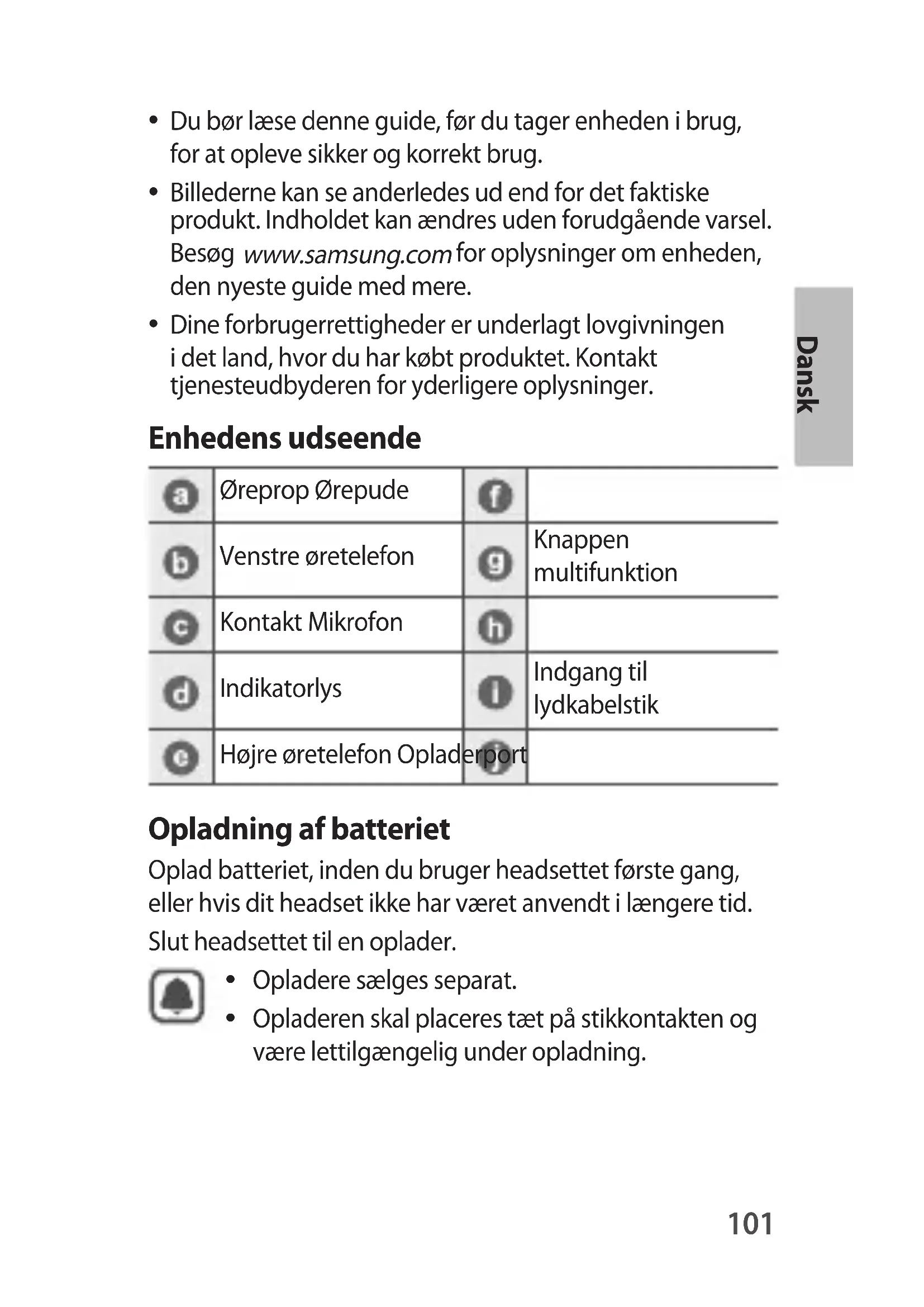 Samsung er ikke erstatningsansvarlig for skader eller tab (uanset om det er inden eller uden for kontrakt, herunder uagtsomhed), som opstår, fordi disse advarsler og instruktioner ikke følges præcist, bortset fra død eller personskade, som skyldes Samsungs uagtsomhed.