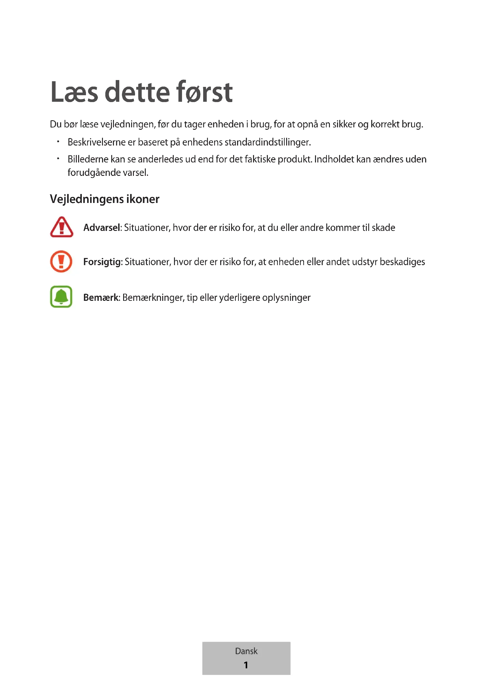 Billederne kan se anderledes ud end for det faktiske produkt. Indholdet kan ændres uden forudgående varsel. Vejledningens ikoner Advarsel: Situationer, hvor der er risiko for, at du eller andre kommer til skade Forsigtig: Situationer, hvor der er risiko for, at enheden eller andet udstyr beskadiges Bemærk: Bemærkninger, tip eller yderligere oplysninger Dansk