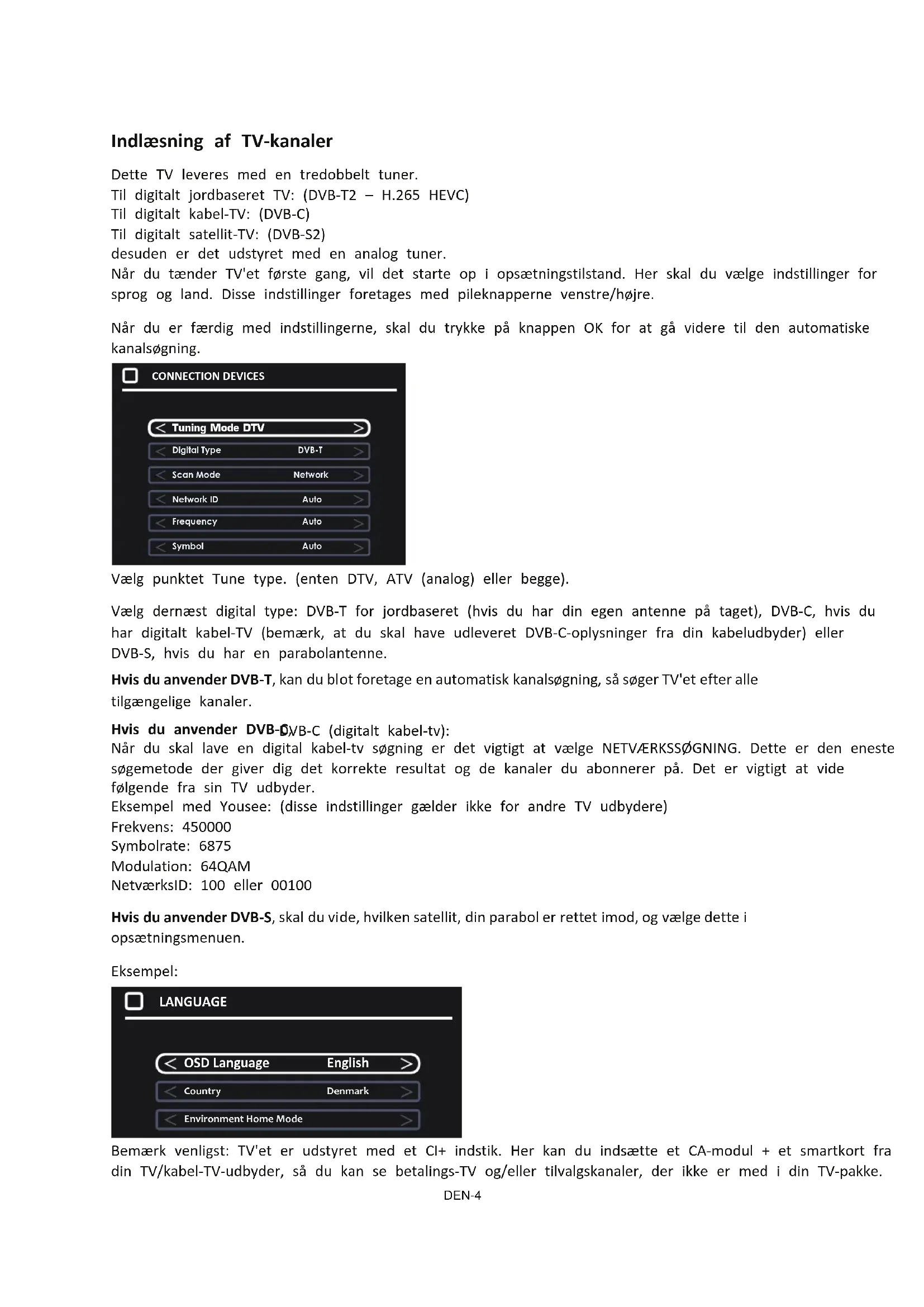 DEN-3 TV1(S2) HDMI3 OPTICALTV2(T2/C)Common InterfaceMini YPbPr Mini AV USB 5V 500mAVGA HDMI1 HDMI2 SCART AUDIO LAN (RJ45) :Forbindestilhovedt elefonerellerandetaudioudstyr. HDM I:ForbindestilHDM I-term inalenpådinDVD-/ Blu-ray-afspillerellerandeteksternt udstyr. PCAudio:Forbindestilaudio-udgangenpåenPC. VGA:IndgangforVGA-signalerfraentilslut t etPC.TilslutdinPCsanalogeD-Sub15-bensudgang. SCART:ForbindestilSCARTvideoudgangenpåenDVD-afspiller. TV1(S2):Forbindestilsatellit-signalet . TV2(T2/ C):Forbindestilant ennestikket ivæggenvedhjælpafetRFantennekabel. M INIYPbPr:Forbindest ilYPbPRvideoudgangenpåenDVDvedhjælpafetkonverterkabel. M INIAV:Forbindest ilaudio-ogvideoudgangenpåenDVDvedhjælpafetkonverterkabel. (Audiot erminalernedelesm edYPbPr) USB:ForbindestilUSB-term inalenpåenmultimedieafspiller. LAN(RJ45): OPTISK CommonInterface:CI-indstik :DEN-4 Indlæsning af TV-kanaler Dette TV leveres med en tredobbelt tuner. Til digitalt jordbaseret TV: (DVB-T2 – H.265 HEVC) Til digitalt kabel-TV: (DVB-C) Til digitalt satellit-TV: (DVB-S2) desuden er det udstyret med en analog tuner. Når du tænder TV'et første gang, vil det starte op i opsætningstilstand. Her skal du vælge indstillinger for sprog og land. Disse indstillinger foretages med pileknapperne venstre/højre. Når du er færdig med indstillingerne, skal du trykke på knappen OK for at gå videre til den automatiske kanalsøgning. Vælg punktet Tune type. (enten DTV, ATV (analog) eller begge). Vælg dernæst digital type: DVB-T for jordbaseret (hvis du har din egen antenne på taget), DVB-C, hvis du har digitalt kabel-TV (bemærk, at du skal have udleveret DVB-C-oplysninger fra din kabeludbyder) eller DVB-S, hvis du har en parabolantenne. Hvis du anvender DVB-T, kan du blot foretage en automatisk kanalsøgning, så søger TV'et efter alle tilgængelige kanaler. Hvis du anvender DVB-C, Hvis du anvender DVB-S, skal du vide, hvilken satellit, din parabol er rettet imod, og vælge dette i opsætningsmenuen. Eksempel: Bemærk venligst: TV'et er udstyret med et CI+ indstik. Her kan du indsætte et CA-modul + et smartkort fra din TV/kabel-TV-udbyder, så du kan se betalings-TV og/eller tilvalgskanaler, der ikke er med i din TV-pakke. DVB-C (digitalt kabel-tv): Når du skal lave en digital kabel-tv søgning er det vigtigt at vælge NETVÆRKSSØGNING. Dette er den eneste søgemetode der giver dig det korrekte resultat og de kanaler du abonnerer på. Det er vigtigt at vide følgende fra sin TV udbyder. Eksempel med Yousee: (disse indstillinger gælder ikke for andre TV udbydere) Frekvens: 450000 Symbolrate: 6875 Modulation: 64QAM NetværksID: 100 eller 00100 CONNECTION DEVICES Tuning Mode DTVDigital TypeScan ModeNetwork IDFrequencySymbolDVB-TNetwork Auto Auto Auto LANGUAGE OSD Language CountryEnvironment Home ModeDenmark EnglishStreaming