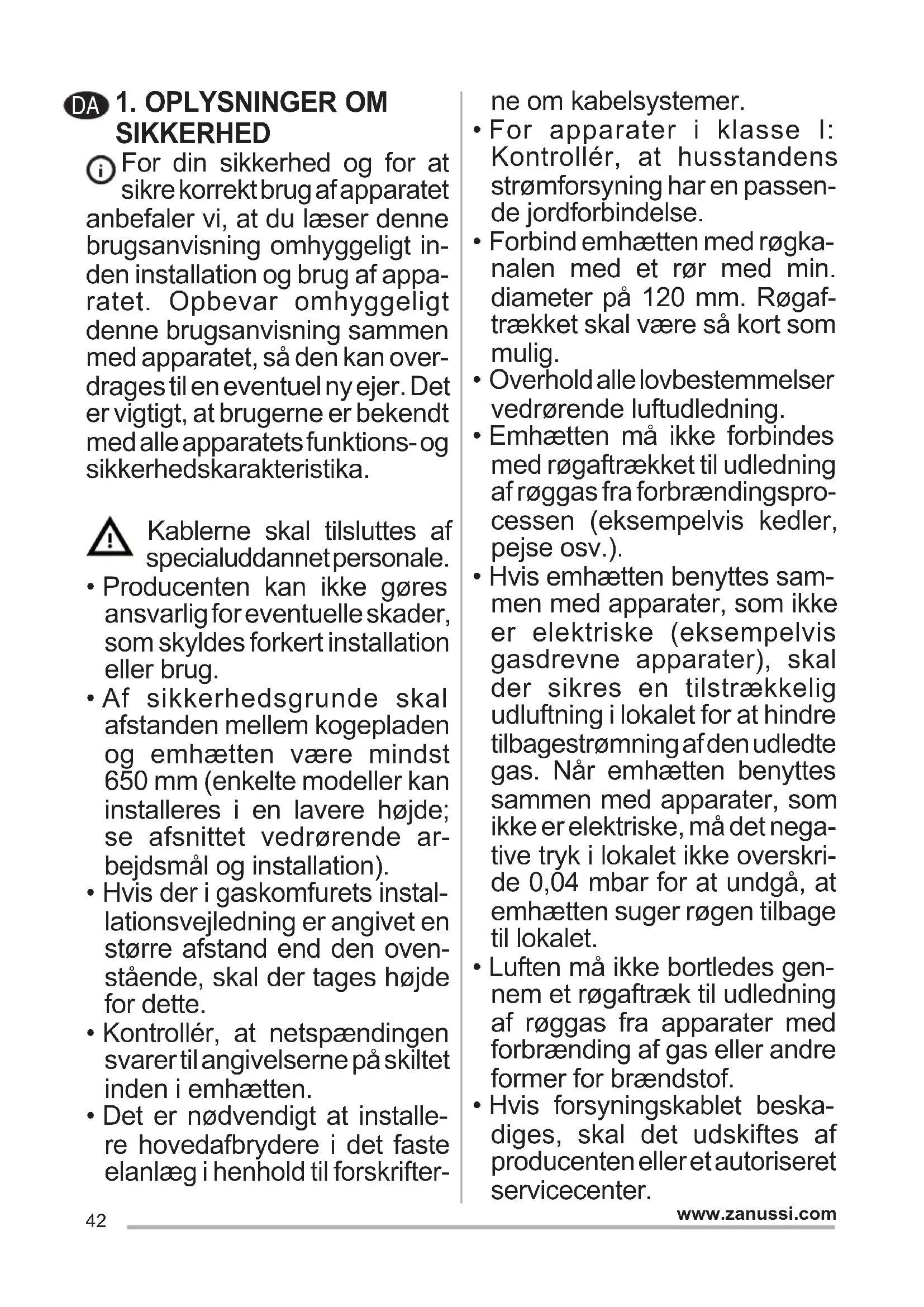 SIKKERHED For din sikkerhed og for at sikre korrekt brug af apparatet anbefaler vi, at du læser denne brugsanvisning omhyggeligt in- den installation og brug af appa- ratet. Opbevar omhyggeligt denne brugsanvisning sammen med apparatet, så den kan over- drages til en eventuel ny ejer. Det er vigtigt, at brugerne er bekendt med alle apparatets funktions- og sikkerhedskarakteristika. Kablerne skal tilsluttes af specialuddannet personale.