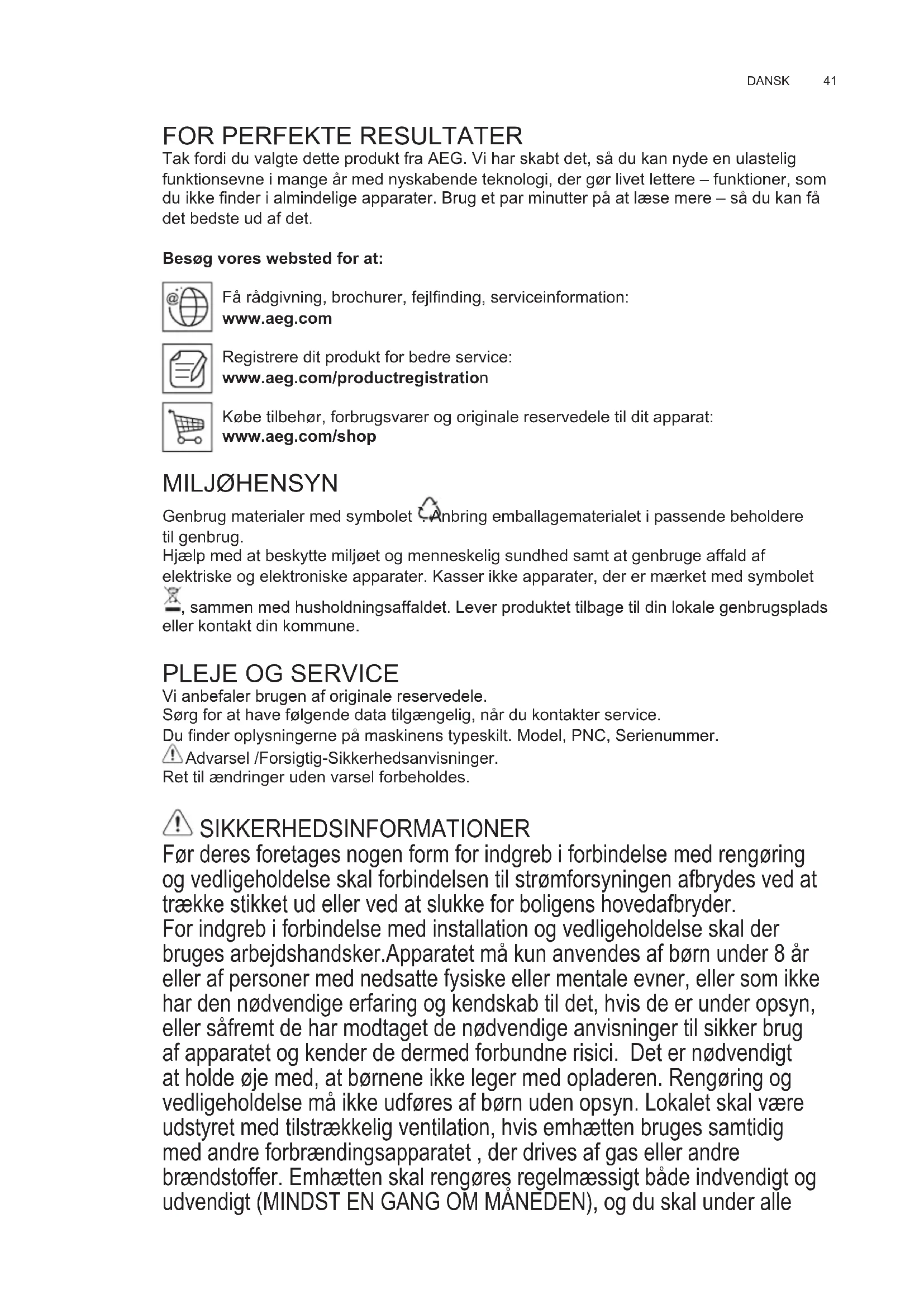 Tak fordi du valgte dette produkt fra AEG. Vi har skabt det, så du kan nyde en ulastelig funktionsevne i mange år med nyskabende teknologi, der gør livet lettere – funktioner, som du ikke nder i almindelige apparater. Brug et par minutter på at læse mere – så du kan få det bedste ud af det. Besøg vores websted for at: Få rådgivning, brochurer, fejlnding, serviceinformation: www.aeg.com Registrere dit produkt for bedre service: www.aeg.com/productregistration Købe tilbehør, forbrugsvarer og originale reservedele til dit apparat: www.aeg.com/shop MILJØHENSYN Genbrug materialer med symbolet . Anbring emballagematerialet i passende beholdere til genbrug. Hjælp med at beskytte miljøet og menneskelig sundhed samt at genbruge affald af elektriske og elektroniske apparater. Kasser ikke apparater, der er mærket med symbolet , sammen med husholdningsaffaldet. Lever produktet tilbage til din lokale genbrugsplads eller kontakt din kommune.