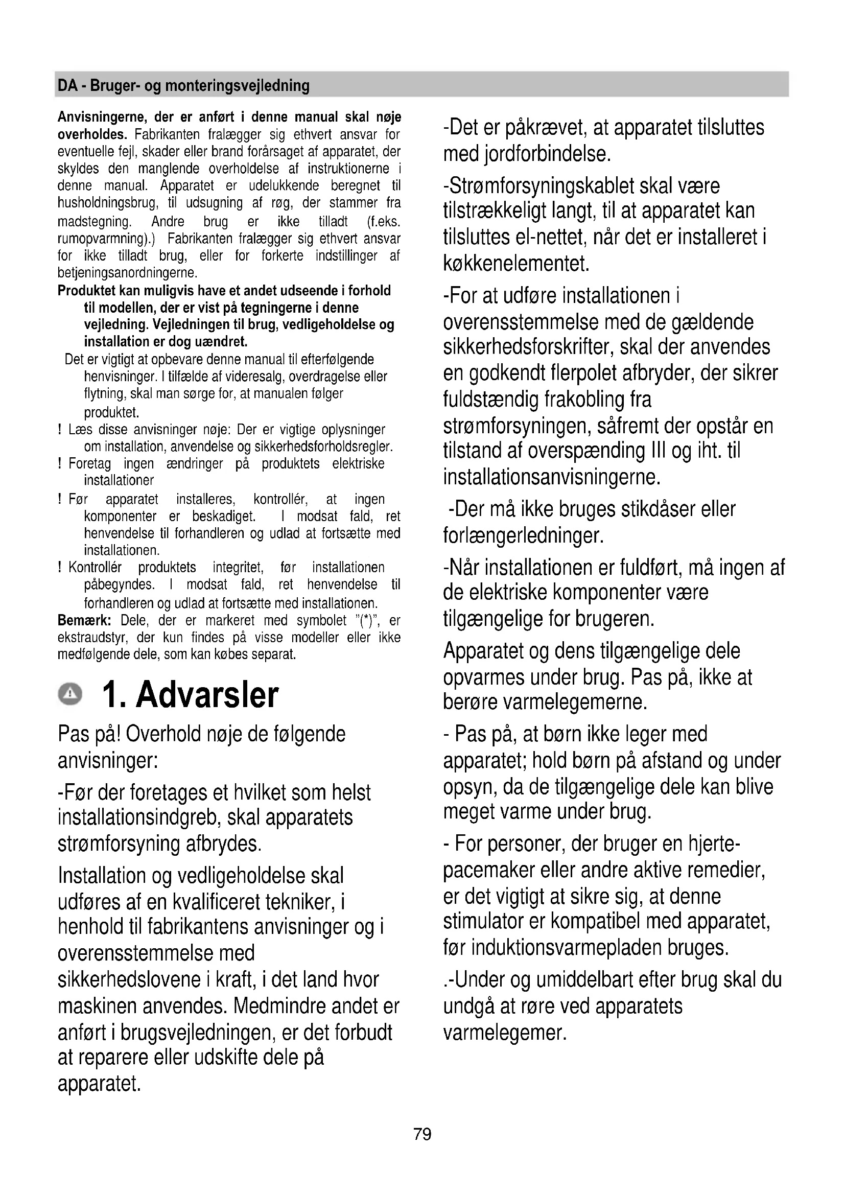 Pas på! Overhold nøje de følgende anvisninger: -Før der foretages et hvilket som helst installationsindgreb, skal apparatets strømforsyning afbrydes. Installation og vedligeholdelse skal udføres af en kvalificeret tekniker, i henhold til fabrikantens anvisninger og i overensstemmelse med sikkerhedslovene i kraft, i det land hvor maskinen anvendes. Medmindre andet er anført i brugsvejledningen, er det forbudt at reparere eller udskifte dele på apparatet. -Det er påkrævet, at apparatet tilsluttes med jordforbindelse. -Strømforsyningskablet skal være tilstrækkeligt langt, til at apparatet kan tilsluttes el-nettet, når det er installeret i køkkenelementet. -For at udføre installationen i overensstemmelse med de gældende sikkerhedsforskrifter, skal der anvendes en godkendt flerpolet afbryder, der sikrer fuldstændig frakobling fra strømforsyningen, såfremt der opstår en tilstand af overspænding III og iht. til installationsanvisningerne. -Der må ikke bruges stikdåser eller forlængerledninger. -Når installationen er fuldført, må ingen af de elektriske komponenter være tilgængelige for brugeren. Apparatet og dens tilgængelige dele opvarmes under brug. Pas på, ikke at berøre varmelegemerne. - Pas på, at børn ikke leger med apparatet; hold børn på afstand og under opsyn, da de tilgængelige dele kan blive meget varme under brug. - For personer, der bruger en hjerte- pacemaker eller andre aktive remedier, er det vigtigt at sikre sig, at denne stimulator er kompatibel med apparatet, før induktionsvarmepladen bruges. .-Under og umiddelbart efter brug skal du undgå at røre ved apparatets varmelegemer.80 -Undgå kontakt med klude eller andre brændbare materialer, før alle apparatets komponenter er tilstrækkeligt afkølede. .-Anbring ikke brændbart materiale på apparatet eller i umiddelbar nærhed. Ophedede fedtmidler eller olier er let antændelige. Overvåg stegningen af retter, der indeholder en stor mængde fedstof eller olie. -Hvis overfladen er revnet, skal du straks slukke det for at undgå elektrisk stød. - Apparatet er ikke beregnet til at blive sat i gang ved hjælp af et udvendigt tidsur eller af et adskilt fjernbetjeningssystem. -Stegning med olie eller fedtstoffer på en kogeplade kan være farlig og forårsage antændelse, hvis den ikke udføres under opsyn. Stegningen skal overvåges. Selv en hurtig stegning skal konstant overvåges. Forsøg ALDRIG at slukke flammerne med vand. Sluk derimod for apparatet og kvæl flammerne, f.eks. ved brug af et låg, eller af et brandbekæmpelsestæppe. Brandfare: Anbring ingen genstande på kogepladens overflader. -Brug ikke damprensere til rengøring. -Anbring ikke metalgenstande som fx. knive, gafler, skeer eller låg på kogepladens overflade, da de risikerer at blive meget varme. - Før apparatet tilsluttes strømforsyningen: Kontrollér dataskiltet (der sidder på apparatets nederste del) for at sikre, at spænding og styrke stemmer overens med nettets specifikationer, og at forsyningsstikket er passende. I tvivlstilfælde, ret henvendelse til en kvalificeret elektriker. Vigtigt: - Efter brug, skal kogepladen slukkes ved brug af den relevante betjeningsanordning, uden blot at stole på indikatoren for gryder. - Undgå at væsker koger over ved at sænke varmen, når du koger eller opvarmer væsker. - Varmelegemerne må ikke være tændt, uanset, om der er tomme gryder eller pander på dem, eller hvis der intet er. - Sluk den pågældende varmezone, når stegningen er afsluttet. Brug aldrig alluminiumfolie eller produkter emballeret med alluminium direkte til stegning. Alluminumfolien risikerer at smelte og skade apparatet uopretteligt. - Opvarm aldrig en dåse eller en blikdåse med madvarer uden at have åbnet den først: Den vil kunne eksplodere! Denne advarsel gælder for alle de andre typer kogeplader. Brug af en kraftig styrke, som Booster- funktionen er ikke egnet til opvarmning af visse væsker, som f.eks. olie til friturestegning. En overdreven varme risikerer at være farlig. I dette tilfælde, tilrådes det at anvende en mindre kraftig styrke.81 Beholderne skal anbringes direkte på kogepladen, og centreres. Anbring aldrig andre genstande mellem gryde og kogeplade. - I tilfælde af meget høje temperaturer sænker apparatet automatisk effektniveauet på de pågældende kogezoner. Før et hvilket som helst rengørings- eller vedligeholdelsesindgreb, skal apparatets strømforsyning afbrydes ved at trække stikket ud, eller ved at frakoble boligens hovedafbryder Til alle installations- og vedligeholdelse- sindgreb anvend arbejdshandsker. Apparatet må kun anvendes af børn, der er mindre end 8 år, eller af personer med nedsatte fysiske, sensoriske, eller mentale evner, eller som ikke har den nødvendige erfaring og kendskab til det, hvis de er under opsyn, eller såfremt de har modtaget de nødvendige anvisninger til sikker brug af apparatet, og har kendskab til de dermed forbundne risici. . Det er nødvendigt at holde øje med, at børn ikke leger med apparatet. Rengøring og vedligeholdelse må ikke udføres af børn uden opsyn. Lokalet skal være udstyret med en passende udluftning, når emhætten anvendes samtidig med andre apparater, der drives af gas eller af andre brændstoffer. Emhætten skal rengøres med hyppige mellemrum, både indvendigt og udven- digt (MINDST EN GANG OM MÅNE- DEN). Overhold under alle omstændi- gheder de udtrykkelige anvisninger i ve- dligeholdelsesvejledningen. Manglende overholdelse af emhættens rengøringsforskrifter og af filtrenes udskiftning og rengøring medfører bran- dfare. Det er strengt forbudt, at flambere retter. Brug af åben ild er skadelig for filtrene og kan medføre brand, og skal af denne grund under alle omstændigheder undgås. Friturestegning skal udelukkende udføres under opsyn, for at undgå, at den overophedede olie antændes. PAS PÅ! Når kogepladen er i brug, kan emhættens tilgængelige dele blive meget varme. Pas på! Apparatet må