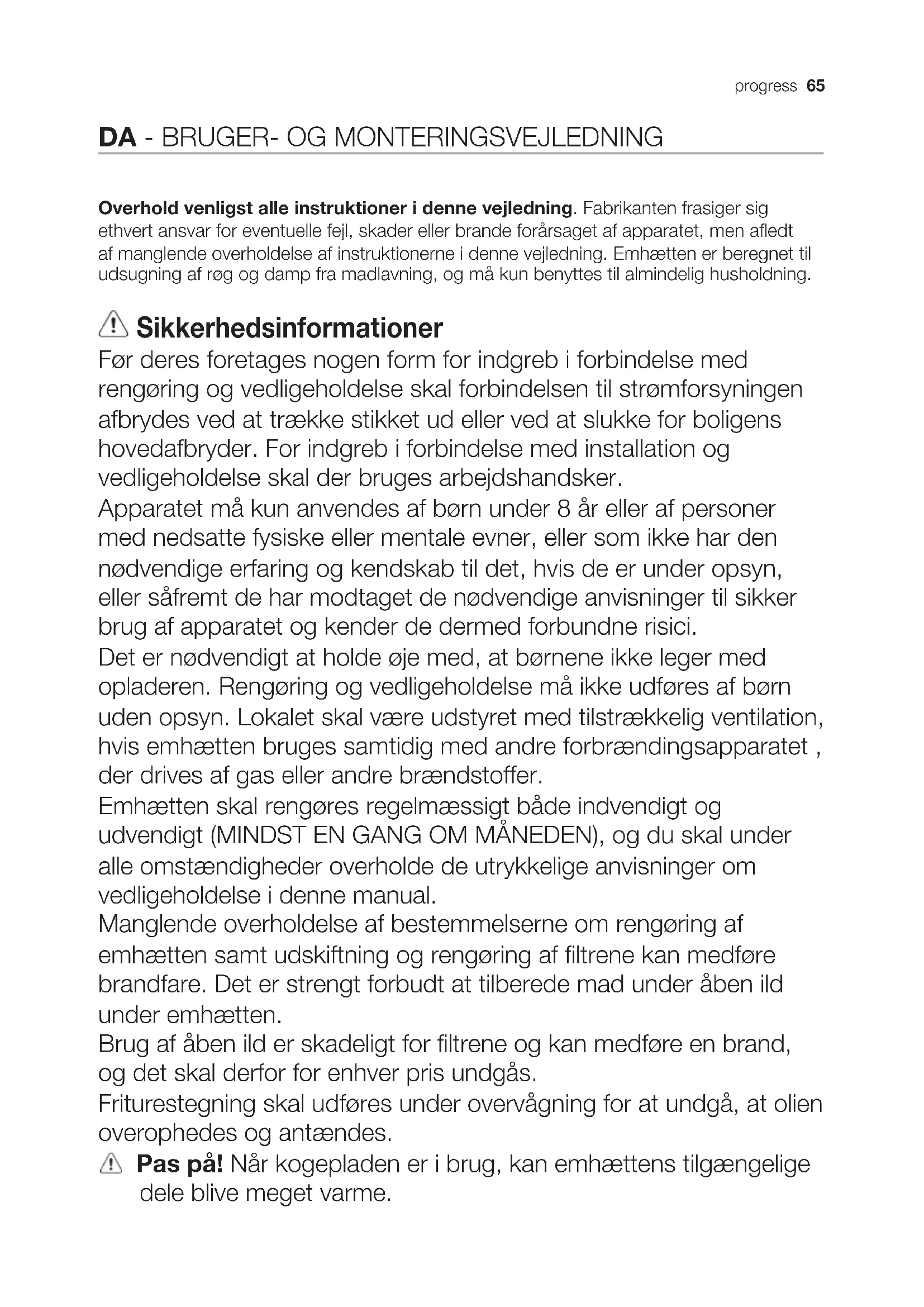 Manglende overholdelse af bestemmelsene om rengoring af emhætten samt udskiftning og rengoring af filtrene kan medføre brandfare. Det er strengt forbudt at tilberede mad under aben ild under emhætten.