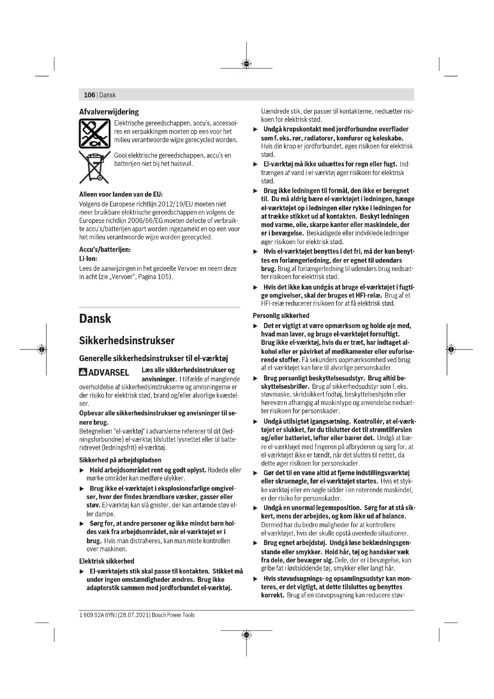 fly. Undgå at bruge værktøjet i umiddelbar nærhed af kroppen i længere tid ad gangen. Mærket Bluetooth® og symbolerne (logoerne) er registre- rede varemærker tilhørende Bluetooth SIG, Inc. Enhver brug af disse mærker/symboler, som Robert Bosch Po- wer Tools GmbH foretager, sker per licens. Produkt- og ydelsesbeskrivelse Læs alle sikkerhedsinstrukser og anvisnin- ger. Overholdes sikkerhedsinstrukserne og an- visningerne ikke, er der risiko for elektrisk stød, brand og/eller alvorlige kvæstelser. Vær opmærksom på alle illustrationer i den forreste del af betjeningsvejledningen. Beregnet anvendelse El-værktøjet er beregnet til skæring, skrubning og børstning af emner i metal og sten uden brug af vand. Til gennemskæring med bundede slibemidler skal der bruges en speciel beskyttelseskappe. Sørg for tilstrækkelig støvopsugning, når der skæres i sten. Med godkendte slibeværktøjer kan el-værktøjet anvendes til sandpapirslibning. Når Bluetooth