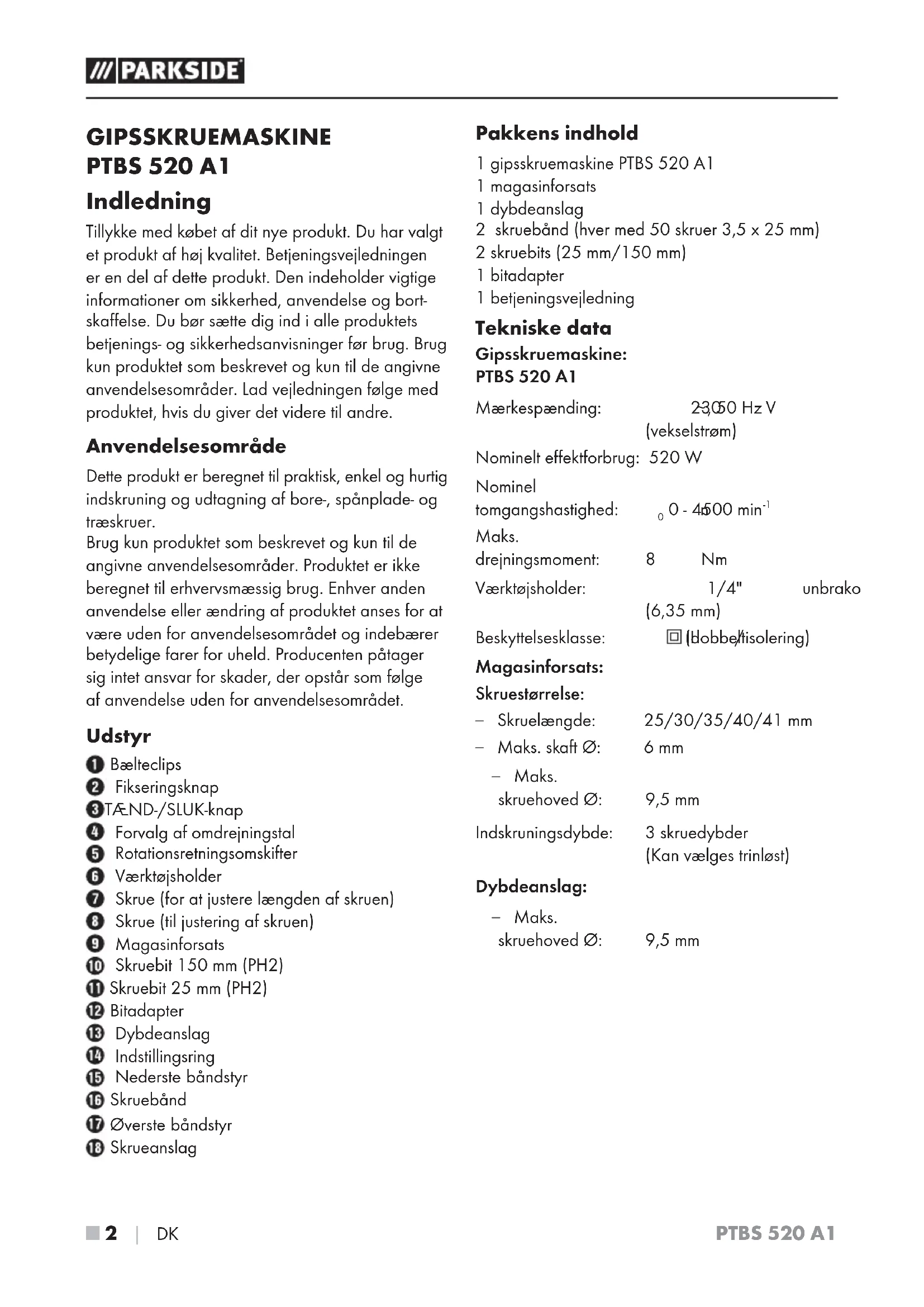 - Oversættelse af den originale overensstemmelseserklæring PTBS 520 A1 ■ 2 │ DK GIPSSKRUEMASKINE PTBS 520 A1 Indledning Tillykke med købet af dit nye produkt. Du har valgt et produkt af høj kvalitet. Betjeningsvejledningen er en del af dette produkt. Den indeholder vigtige informationer om sikkerhed, anvendelse og bort- skaffelse. Du bør sætte dig ind i alle produktets betjenings- og sikkerhedsanvisninger før brug. Brug kun produktet som beskrevet og kun til de angivne anvendelsesområder. Lad vejledningen følge med produktet, hvis du giver det videre til andre. Anvendelsesområde Dette produkt er beregnet til praktisk, enkel og hurtig indskruning og udtagning af bore-, spånplade- og træskruer. Brug kun produktet som beskrevet og kun til de angivne anvendelsesområder. Produktet er ikke beregnet til erhvervsmæssig brug. Enhver anden anvendelse eller ændring af produktet anses for at være uden for anvendelsesområdet og indebærer betydelige farer for uheld. Producenten påtager sig intet ansvar for skader, der opstår som følge af anvendelse uden for anvendelsesområdet. Udstyr Bælteclips Fikseringsknap TÆND-/SLUK-knap Forvalg af omdrejningstal Rotationsretningsomskifter Værktøjsholder Skrue (for at justere længden af skruen) Skrue (til justering af skruen) Magasinforsats Skruebit 150 mm (PH2) Skruebit 25 mm (PH2) Bitadapter Dybdeanslag Indstillingsring Nederste båndstyr Skruebånd Øverste båndstyr Skrueanslag Pakkens indhold 1 gipsskruemaskine PTBS 520 A1 1 magasinforsats 1 dybdeanslag 2 skruebånd (hver med 50 skruer 3,5 x 25 mm) 2 skruebits (25 mm/150 mm) 1 bitadapter 1 betjeningsvejledning Tekniske data Gipsskruemaskine: PTBS 520 A1 Mærkespænding: 230 V p. 10