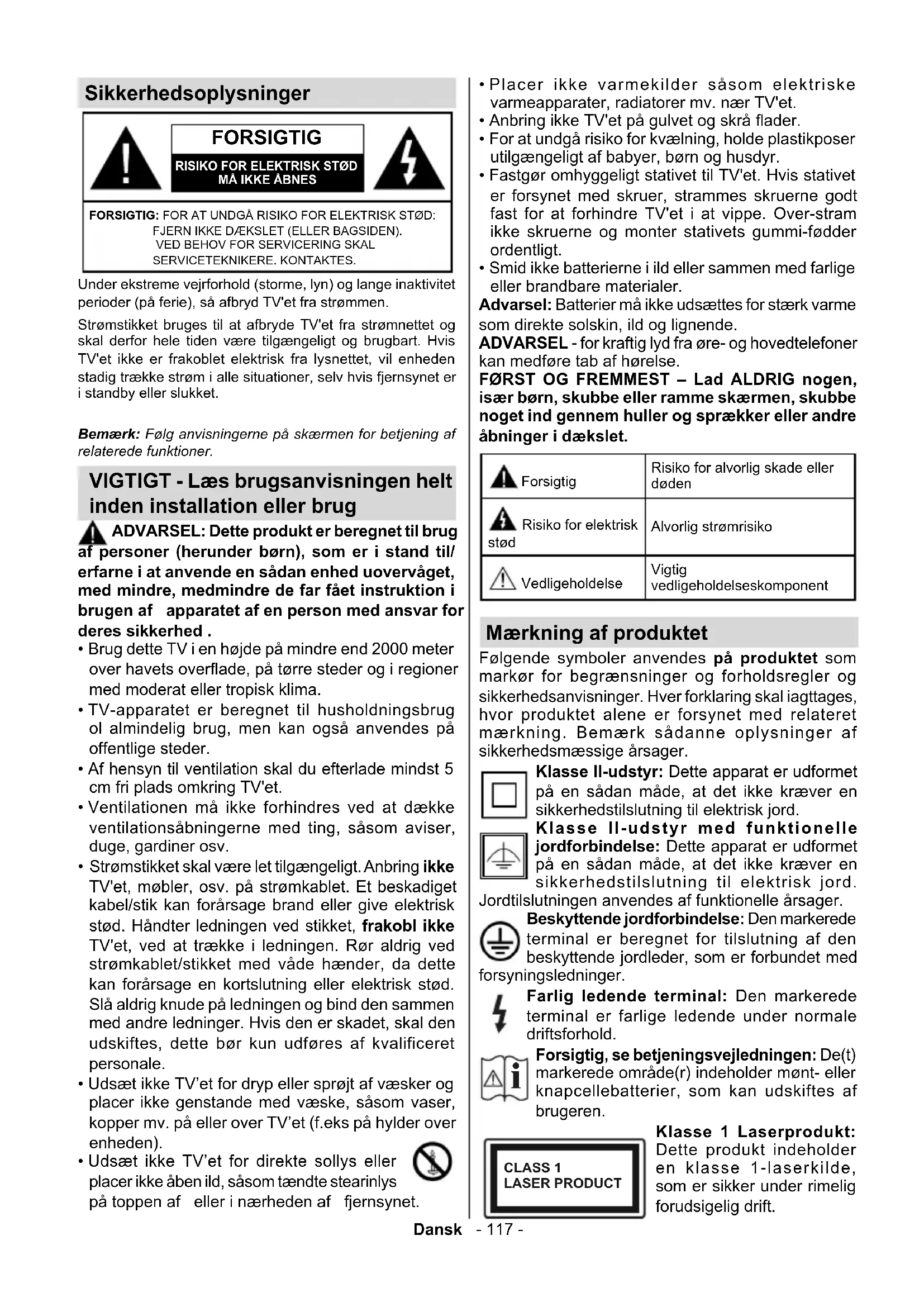 Trådløse LAN-Specikationer (**) ......................122Dansk - 117 - Sikkerhedsoplysninger FORSIGTIG RISIKO FOR ELEKTRISK STØDMÅ IKKE ÅBNESFORSIGTIG: FOR AT UNDGÅ RISIKO FOR ELEKTRISK STØD: FJERN IKKE DÆKSLET (ELLER BAGSIDEN). VED BEHOV FOR SERVICERING SKAL SERVICETEKNIKERE. KONTAKTES. Bemærk: Følg anvisningerne på skærmen for betjening af relaterede funktioner. Under ekstreme vejrforhold (storme, lyn) og lange inaktivitet perioder (på ferie), så afbryd TV'et fra strømmen. Strømstikket bruges til at afbryde TV'et fra strømnettet og skal derfor hele tiden være tilgængeligt og brugbart. Hvis TV'et ikke er frakoblet elektrisk fra lysnettet, vil enheden stadig trække strøm i alle situationer, selv hvis fjernsynet er i standby eller slukket. VIGTIGT - Læs brugsanvisningen helt inden installation eller brug ADVARSEL: Dette produkt er beregnet til brug af personer (herunder børn), som er i stand til/ erfarne i at anvende en sådan enhed uovervåget, med mindre, medmindre de far fået instruktion i brugen af apparatet af en person med ansvar for deres sikkerhed .