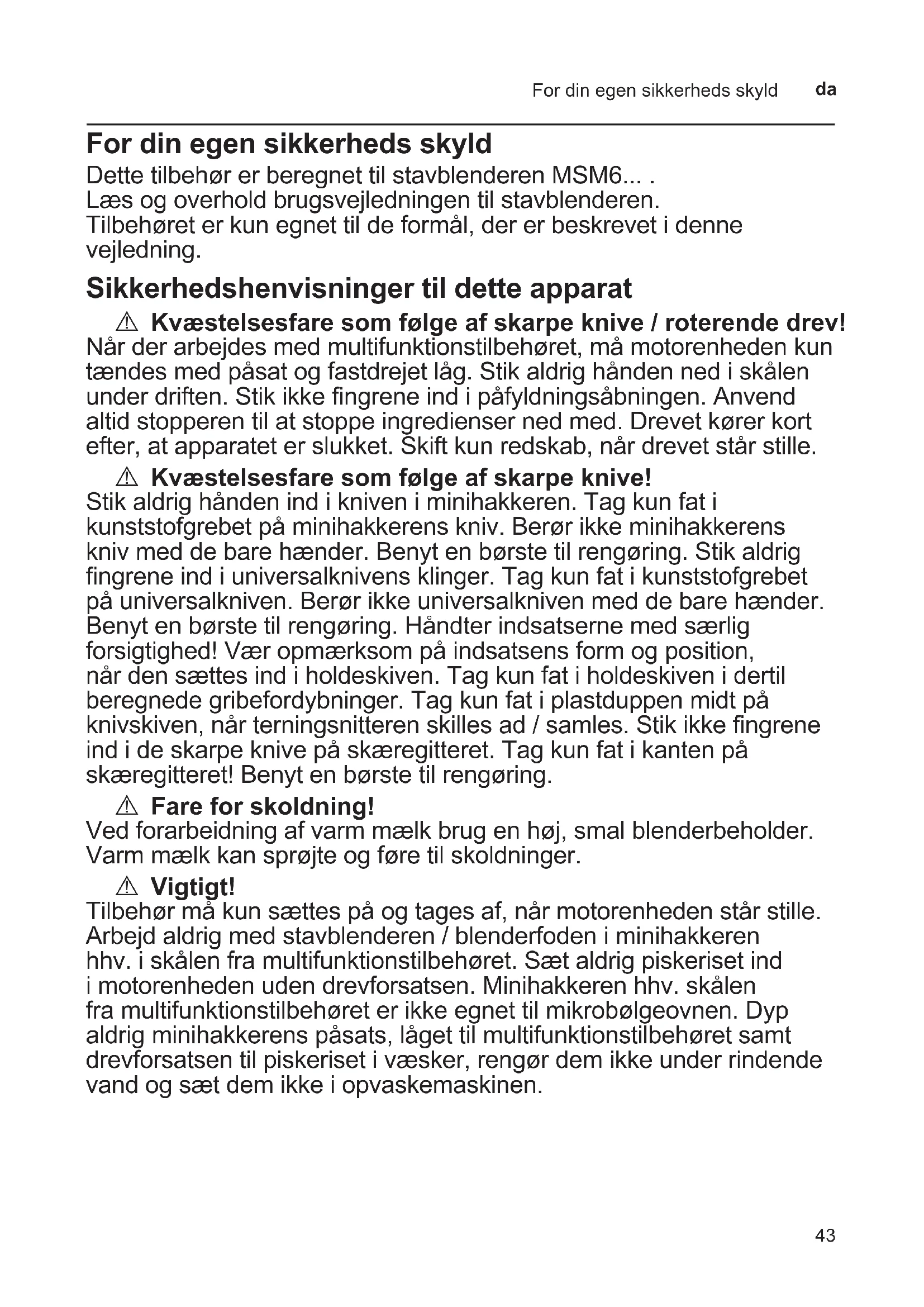 For din egen sikkerheds skyld Dette tilbehør er beregnet til stavblenderen MSM6... . Læs og overhold brugsvejledningen til stavblenderen. Tilbehøret er kun egnet til de formål, der er beskrevet i denne vejledning. Sikkerhedshenvisninger til dette apparat A Kvæstelsesfare som følge af skarpe knive / roterende drev! Når der arbejdes med multifunktionstilbehøret, må motorenheden kun tændes med påsat og fastdrejet låg. Stik aldrig hånden ned i skålen under driften. Stik ikke ngrene ind i påfyldningsåbningen. Anvend altid stopperen til at stoppe ingredienser ned med. Drevet kører kort efter, at apparatet er slukket. Skift kun redskab, når drevet står stille. A Kvæstelsesfare som følge af skarpe knive! Stik aldrig hånden ind i kniven i minihakkeren. Tag kun fat i kunststofgrebet på minihakkerens kniv. Berør ikke minihakkerens kniv med de bare hænder. Benyt en børste til rengøring. Stik aldrig ngrene ind i universalknivens klinger. Tag kun fat i kunststofgrebet på universalkniven. Berør ikke universalkniven med de bare hænder. Benyt en børste til rengøring. Håndter indsatserne med særlig forsigtighed! Vær opmærksom på indsatsens form og position, når den sættes ind i holdeskiven. Tag kun fat i holdeskiven i dertil beregnede gribefordybninger. Tag kun fat i plastduppen midt på knivskiven, når terningsnitteren skilles ad / samles. Stik ikke ngrene ind i de skarpe knive på skæregitteret. Tag kun fat i kanten på skæregitteret! Benyt en børste til rengøring. A Fare for skoldning! Ved forarbeidning af varm mælk brug en høj, smal blenderbeholder. Varm mælk kan sprøjte og føre til skoldninger. A Vigtigt! Tilbehør må kun sættes på og tages af, når motorenheden står stille. Arbejd aldrig med stavblenderen / blenderfoden i minihakkeren hhv. i skålen fra multifunktionstilbehøret. Sæt aldrig piskeriset ind i motorenheden uden drevforsatsen. Minihakkeren hhv. skålen fra multifunktionstilbehøret er ikke egnet til mikrobølgeovnen. Dyp aldrig minihakkerens påsats, låget til multifunktionstilbehøret samt drevforsatsen til piskeriset i væsker, rengør dem ikke under rindende vand og sæt dem ikke i opvaskemaskinen.44 Minihakker