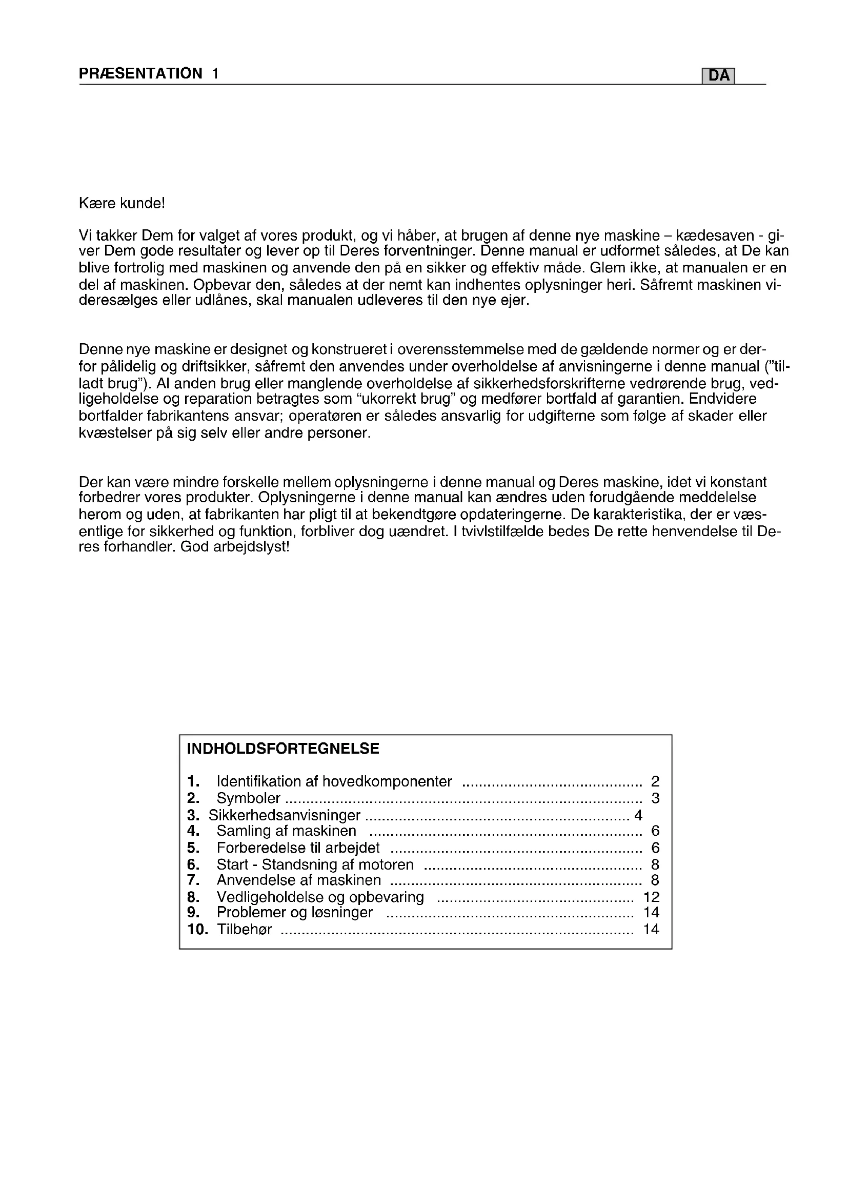 Kulku TERÄLEVY KETJU Tuumaa Pituus Tuumaa / cm Uran Leveys Tuumaa / mm Koodi Koodi 3/8” 16” / 40 cm 0,050” / 1,3 mm 123900368/0 4113765DA PRÆSENTATION 1 Kære kunde! Vi takker Dem for valget af vores produkt, og vi håber, at brugen af denne nye maskine – kædesaven - gi- ver Dem gode resultater og lever op til Deres forventninger. Denne manual er udformet således, at De kan blive fortrolig med maskinen og anvende den på en sikker og effektiv måde. Glem ikke, at manualen er en del af maskinen. Opbevar den, således at der nemt kan indhentes oplysninger heri. Såfremt maskinen vi- deresælges eller udlånes, skal manualen udleveres til den nye ejer. Denne nye maskine er designet og konstrueret i overensstemmelse med de gældende normer og er der- for pålidelig og driftsikker, såfremt den anvendes under overholdelse af anvisningerne i denne manual (”til- ladt brug”). Al anden brug eller manglende overholdelse af sikkerhedsforskrifterne vedrørende brug, ved- ligeholdelse og reparation betragtes som “ukorrekt brug” og medfører bortfald af garantien. Endvidere bortfalder fabrikantens ansvar; operatøren er således ansvarlig for udgifterne som følge af skader eller kvæstelser på sig selv eller andre personer. Der kan være mindre forskelle mellem oplysningerne i denne manual og Deres maskine, idet vi konstant forbedrer vores produkter. Oplysningerne i denne manual kan ændres uden forudgående meddelelse herom og uden, at fabrikanten har pligt til at bekendtgøre opdateringerne. De karakteristika, der er væs- entlige for sikkerhed og funktion, forbliver dog uændret. I tvivlstilfælde bedes De rette henvendelse til De- res forhandler. God arbejdslyst! INDHOLDSFORTEGNELSE