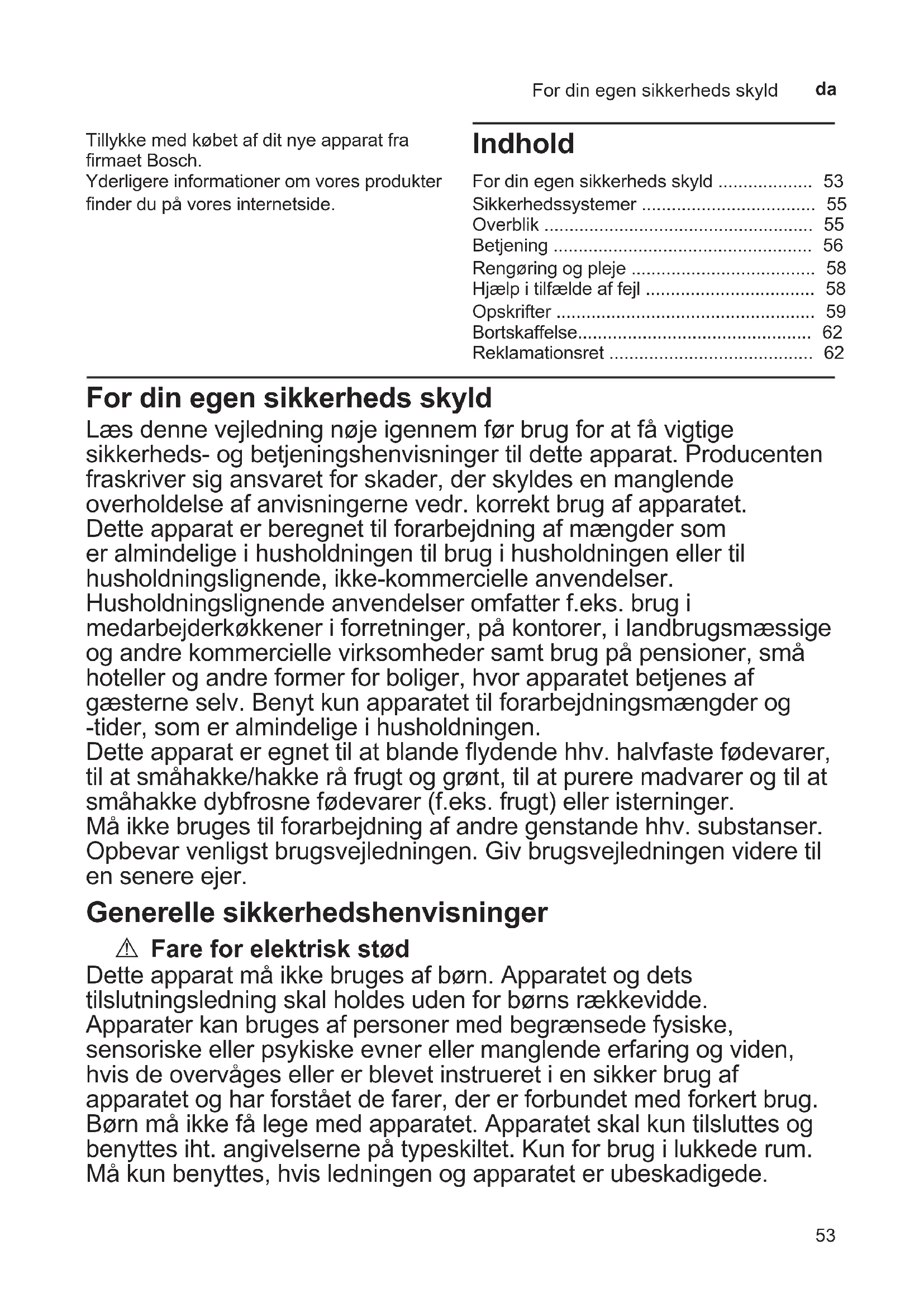 - For din egen sikkerheds skyld Læsdennevejledningnøjeigennemførbrugforatfåvigtige sikkerheds-ogbetjeningshenvisningertildetteapparat.Producenten fraskriversigansvaretforskader,derskyldesenmanglende overholdelseafanvisningernevedr.korrektbrugafapparatet. Detteapparaterberegnettilforarbejdningafmængdersom eralmindeligeihusholdningentilbrugihusholdningenellertil husholdningslignende,ikke-kommercielleanvendelser. Husholdningslignendeanvendelseromfatterf.eks.brugi medarbejderkøkkeneriforretninger,påkontorer,ilandbrugsmæssige ogandrekommerciellevirksomhedersamtbrugpåpensioner,små hotellerogandreformerforboliger,hvorapparatetbetjenesaf gæsterneselv.Benytkunapparatettilforarbejdningsmængderog -tider,someralmindeligeihusholdningen. Detteapparateregnettilatblandeydendehhv.halvfastefødevarer, tilatsmåhakke/hakkeråfrugtoggrønt,tilatpureremadvarerogtilat småhakkedybfrosnefødevarer(f.eks.frugt)elleristerninger. Måikkebrugestilforarbejdningafandregenstandehhv.substanser. Opbevarvenligstbrugsvejledningen.Givbrugsvejledningenvideretil ensenereejer. Generelle sikkerhedshenvisninger A Fare for elektrisk stød Detteapparatmåikkebrugesafbørn.Apparatetogdets tilslutningsledningskalholdesudenforbørnsrækkevidde. Apparaterkanbrugesafpersonermedbegrænsedefysiske, sensoriskeellerpsykiskeevnerellermanglendeerfaringogviden, hvisdeovervågesellererblevetinstrueretiensikkerbrugaf apparatetogharforståetdefarer,dererforbundetmedforkertbrug. Børnmåikkefålegemedapparatet.Apparatetskalkuntilsluttesog benyttesiht.angivelsernepåtypeskiltet.Kunforbrugilukkederum. Måkunbenyttes,hvisledningenogapparateterubeskadigede. Tillykkemedkøbetafditnyeapparatfra rmaetBosch. Yderligereinformationeromvoresprodukter nderdupåvoresinternetside. Indhold Fordinegensikkerhedsskyld p. 53