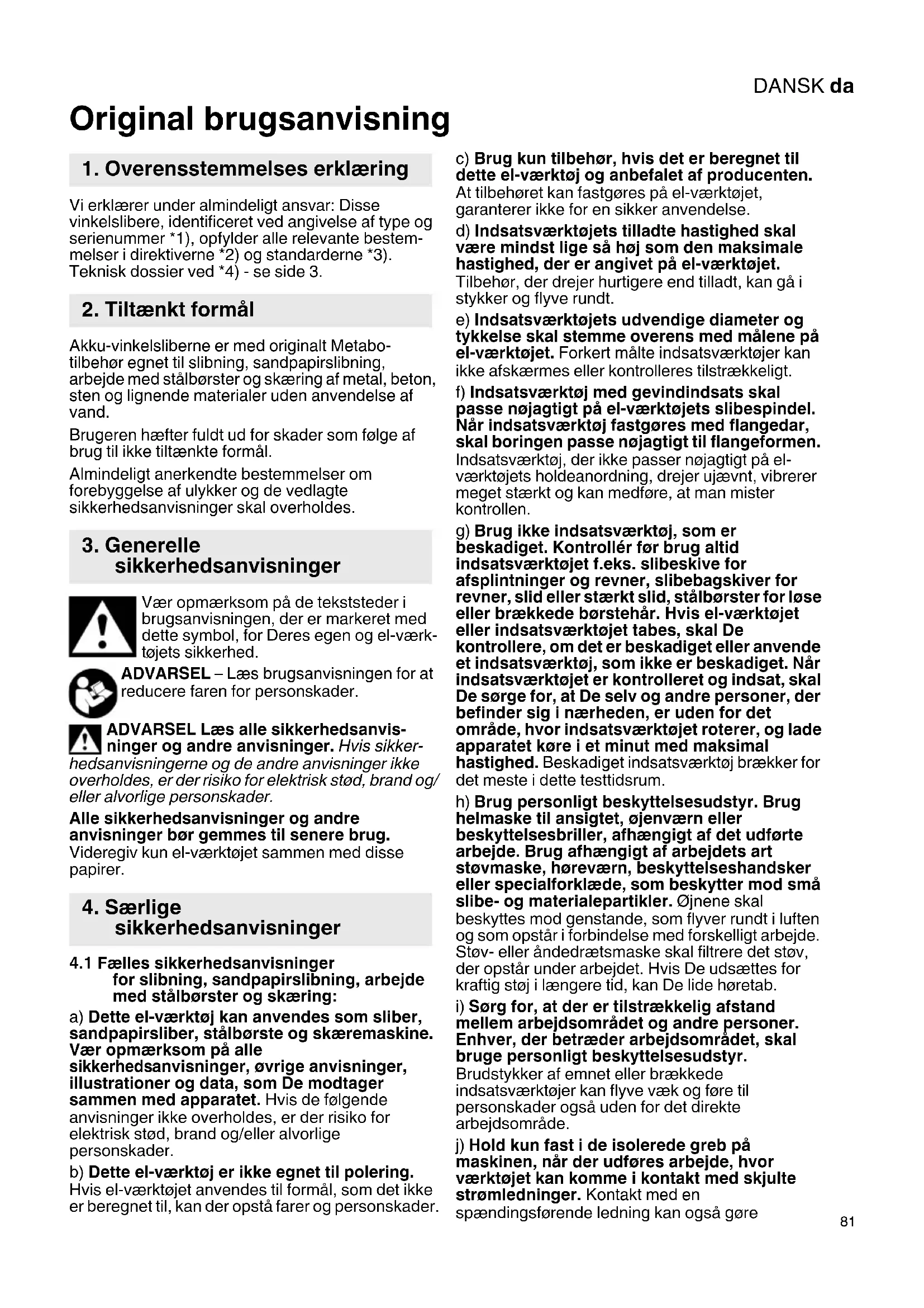 Original brugsanvisning Vi erklærer under almindeligt ansvar: Disse vinkelslibere, identificeret ved angivelse af type og serienummer *1), opfylder alle relevante bestem- melser i direktiverne *2) og standarderne *3). Teknisk dossier ved *4) - se side 3. Akku-vinkelsliberne er med originalt Metabo- tilbehør egnet til slibning, sandpapirslibning, arbejde med stålbørster og skæring af metal, beton, sten og lignende materialer uden anvendelse af vand. Brugeren hæfter fuldt ud for skader som følge af brug til ikke tiltænkte formål. Almindeligt anerkendte bestemmelser om forebyggelse af ulykker og de vedlagte sikkerhedsanvisninger skal overholdes. Vær opmærksom på de tekststeder i brugsanvisningen, der er markeret med dette symbol, for Deres egen og el-værk- tøjets sikkerhed. ADVARSEL – Læs brugsanvisningen for at reducere faren for personskader. ADVARSEL Læs alle sikkerhedsanvis- ninger og andre anvisninger. Hvis sikker- hedsanvisningerne og de andre anvisninger ikke overholdes, er der risiko for elektrisk stød, brand og/ eller alvorlige personskader. Alle sikkerhedsanvisninger og andre anvisninger bør gemmes til senere brug. Videregiv kun el-værktøjet sammen med disse papirer.