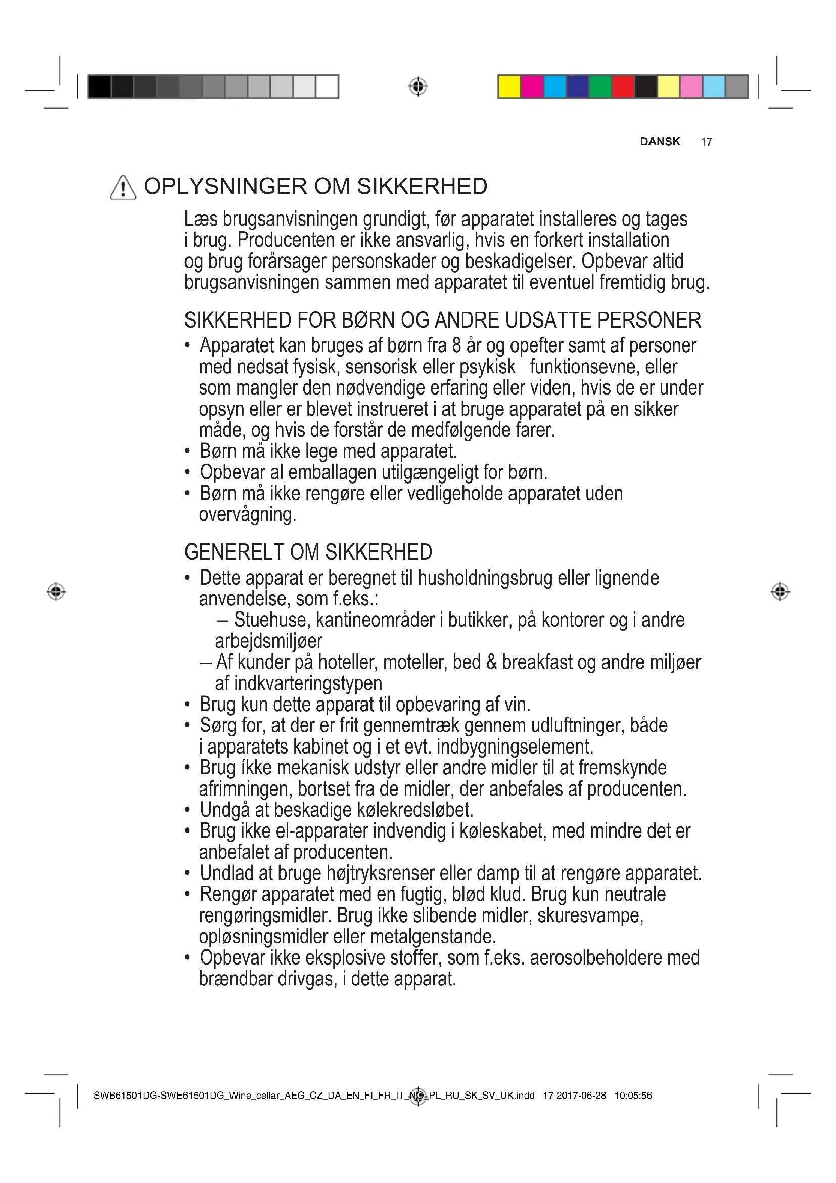 - Hvis netledningen er beskadiget, skal den udskiftes af producenten, dennes serviceagent eller lignende kvalicerede personer for at undgå en fare. SWB61501DG-SWE61501DG_Wine_cellar_AEG_CZ_DA_EN_FI_FR_IT_NO_PL_RU_SK_SV_UK.indd 18 2017-06-28 10:05:5619 DANSK