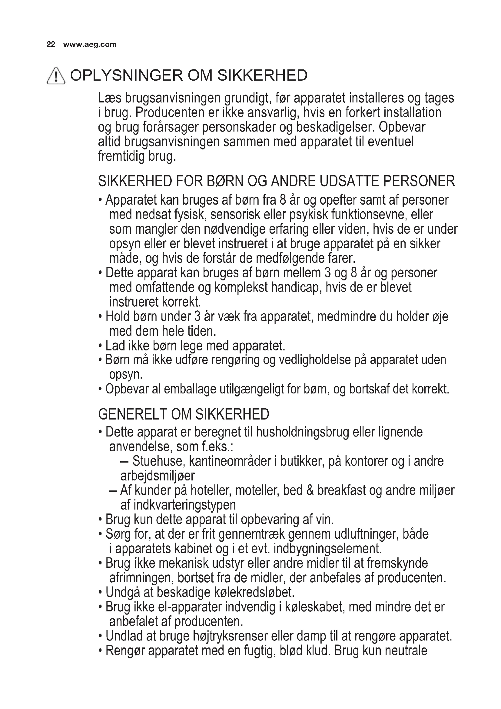- Hvis netledningen er beskadiget, skal den udskiftes af producenten, dennes serviceagent eller lignende kvalicerede personer for at undgå en fare.24 www.aeg.com