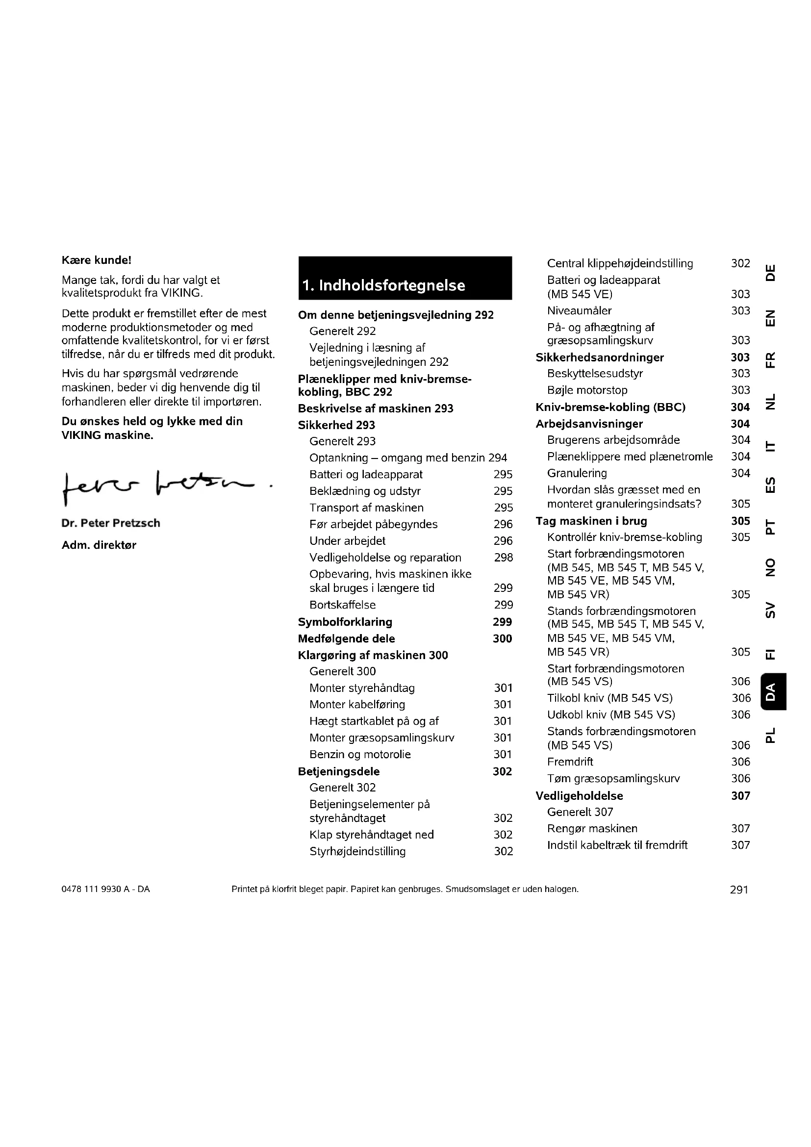 DEENFRNLITESPTNOSVFIPL DA 0478 111 9930 A - DA Kære kunde! Mange tak, fordi du har valgt et kvalitetsprodukt fra VIKING. Dette produkt er fremstillet efter de mest moderne produktionsmetoder og med omfattende kvalitetskontrol, for vi er først tilfredse, når du er tilfreds med dit produkt. Hvis du har spørgsmål vedrørende maskinen, beder vi dig henvende dig til forhandleren eller direkte til importøren. Du ønskes held og lykke med din VIKING maskine. Adm. direktør Printet på klorfrit bleget papir. Papiret kan genbruges. Smudsomslaget er uden halogen.