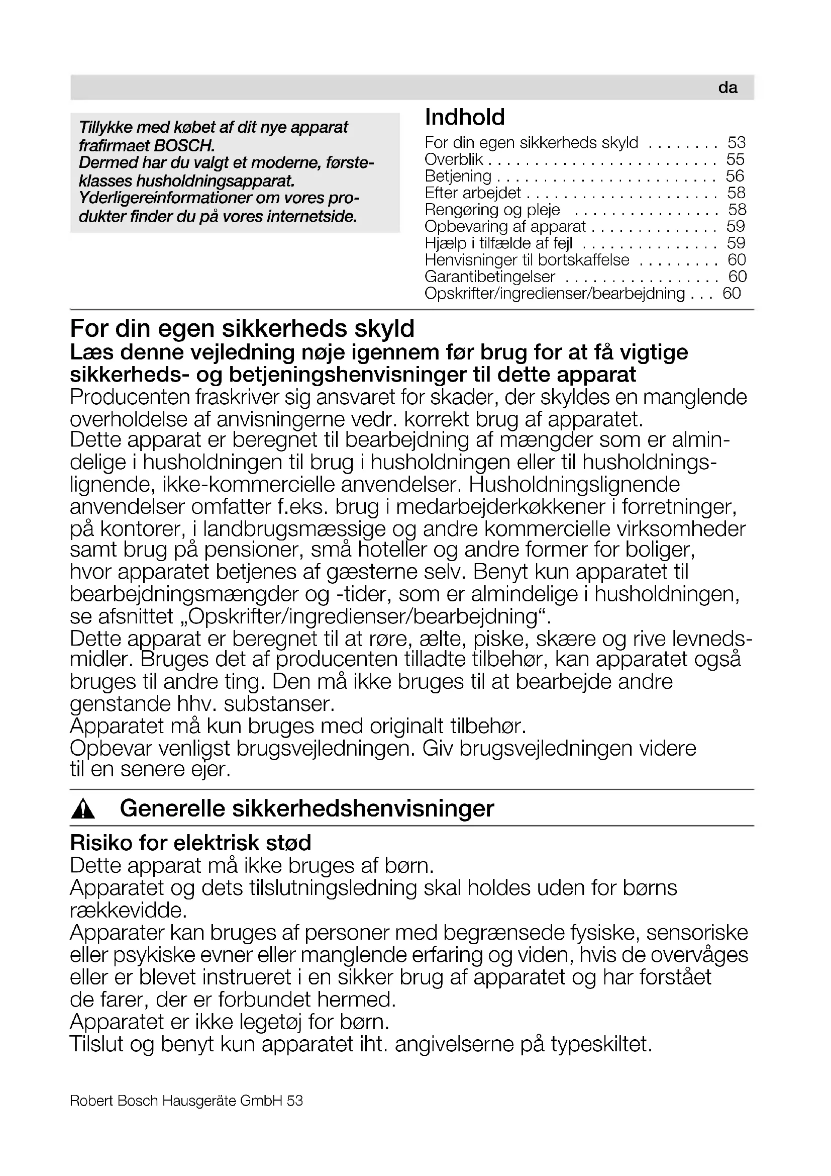 c~êÉ=Ñçê=âî‹ëíÉäëÉê> _äÉåÇÉê=ã™=~äÇêáÖ=ë~ãäÉë=é™=ãçíçêÉåÜÉÇÉåK Bemærk: Alle tilbehørsdele skal tages ud af skål hhv. af blender før brug. Sæt kun de dele ind, der er brug for. c~êÉ=Ñçê=âî‹ëíÉäëÉê> qê‹â=~äíáÇ=åÉíëíáââÉí=ìÇ=ÑçêáåÇÉå=Çì= ~ÑÜà‹äéÉê=Éå=ÑÉàäK Vigtig henvisning for MCM42.. Forkert betjening af apparatet, en udløs- ning af de elektroniske sikringer hhv. en defekt på apparatet vises med en blinkende driftsindikator. Vigtig henvisning Kan fejlen ikke afhjælpes på denne måde, bedes du kontakte kundeservice.60 Robert Bosch Hausgeräte GmbH Henvisninger til bortskaffelse Dette apparat er mærket iht. bestem- melserne i det europæiske direktiv 2012/19/EF om affald af elektrisk og elektronisk udstyr (waste electrical and electronic equipment – WEEE). Direktivet indeholder bestemmelser mht. retur og brug af gammelt elektrisk og elektronisk udstyr, der gælder i hele EU-området. Brug genbrugsordningerne for emballage og ældre apparater og vær med til at skåne miljøet. Er der tvivl om ordningerne og hvor genbrugspladserne er placeret, kan kommunen kontaktes. Garantibetingelser På dette apparat yder BOSCH 1 års garanti. Købsnota skal altid vedlægges ved indsendelse til reparation, hvis denne ønskes udført på garanti. Medfølger købsnota ikke, vil repara- tionen altid blive udført mod beregning. Indsendelse til reparation. Skulle Deres BOSCH apparat gå i stykker, kan indsendes til vort serviceværksted: BSH Hvidevarer A/S, Telegrafvej 6, 2750 Ballerup, tlf. 44-898985. På reparationer ydes 12 måneders garanti. De kan naturligvis også indsende apparatet gennem Deres lokale forhandler. Opskrifter/ingredienser/bearbejdning
