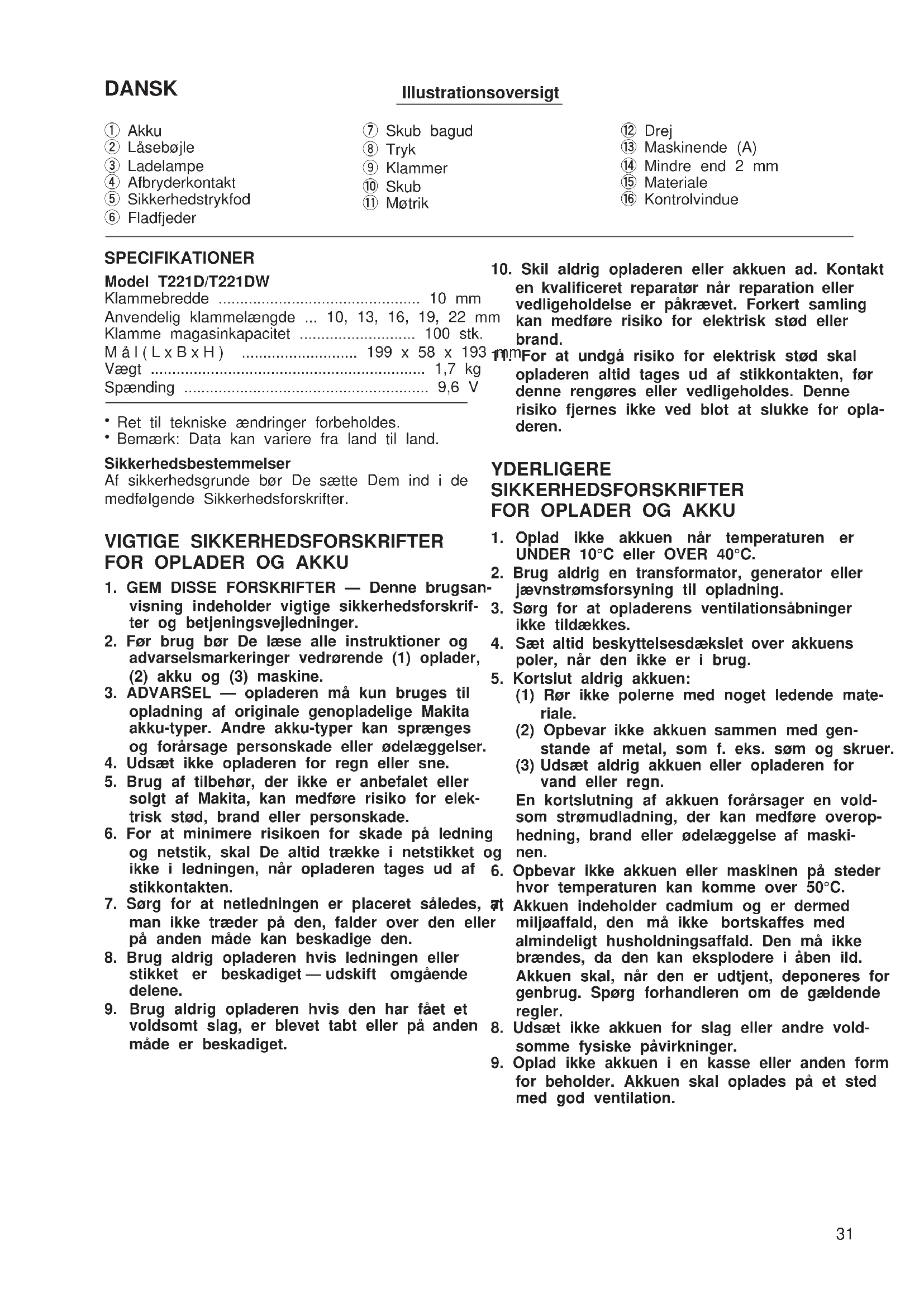 for beholder. Akkuen skal oplades på et sted med god ventilation. T221D (Dan) (’100. 3. 17) 31YDERLIGERE SIKKERHEDSFORSKRIFTER FOR MASKINEN