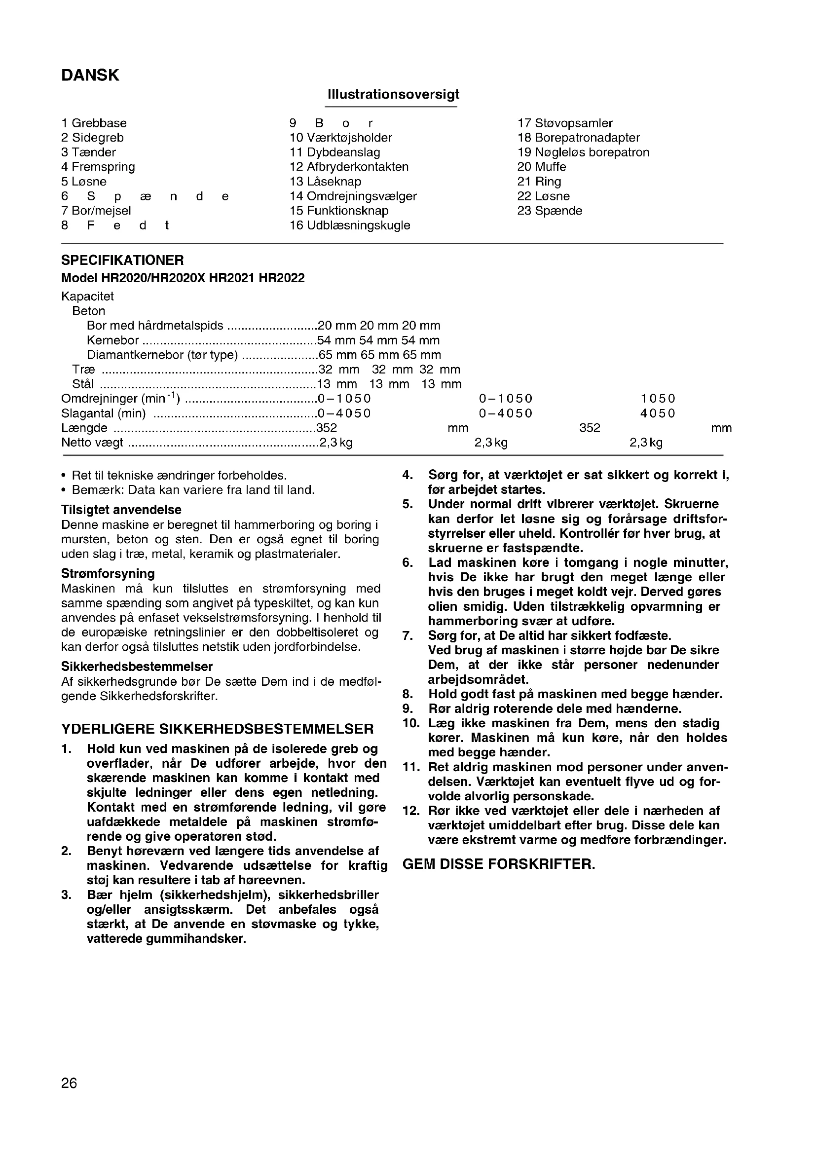 - Bemærk: Data kan variere fra land til land. Tilsigtet anvendelse Denne maskine er beregnet til hammerboring og boring i mursten, beton og sten. Den er også egnet til boring uden slag i træ, metal, keramik og plastmaterialer. Strømforsyning Maskinen må kun tilsluttes en strømforsyning med samme spænding som angivet på typeskiltet, og kan kun anvendes på enfaset vekselstrømsforsyning. I henhold til de europæiske retningslinier er den dobbeltisoleret og kan derfor også tilsluttes netstik uden jordforbindelse. Sikkerhedsbestemmelser Af sikkerhedsgrunde bør De sætte Dem ind i de medføl- gende Sikkerhedsforskrifter. YDERLIGERE SIKKERHEDSBESTEMMELSER