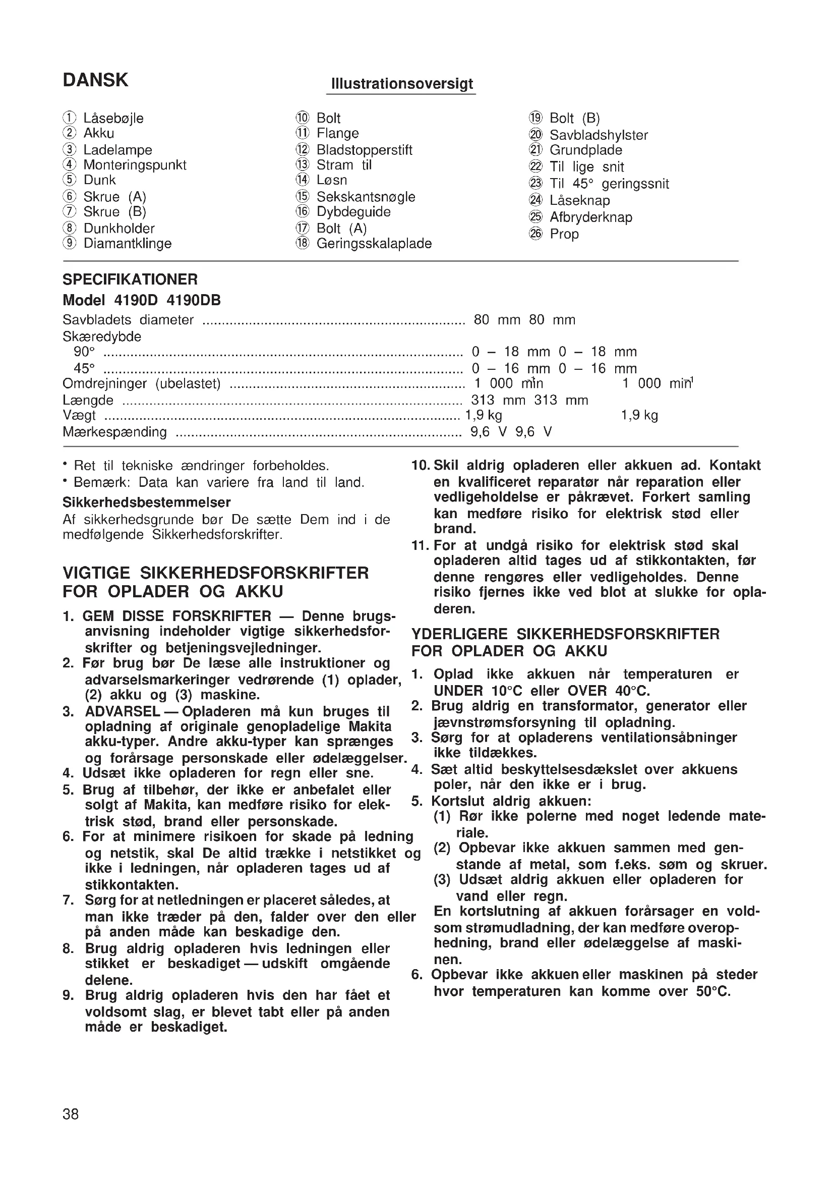 Hvis savningen forringes, skærp da bladets skære- kant med et stykke beton eller en brugt bænkesli- berskive. Skærp ved at trykke let på bladets ydre kant. Savekapacitet Den følgende tabel angiver den omtrentlige saveka- pacitet efter en enkelt opladning af akkuen. Materiale Tykkelse Savelængde (90°) 4190D 4190DB Glas 3mm 5m 8m 5mm 2m 3m Keramiske fliser 5mm 4m 6m 10 mm 3,5 m 5,5m ADVARSEL: Hvis maskinen anvendes helt til akkuen er opbrugt, skal den hvile i 15 minutter før der fortsættes med et nyt batteri. VEDLIGEHOLDELSE ADVARSEL: Sørg altid for at maskinen er slukket, og at akkuen er taget ud før der gennemføres noget arbejde på selve maskinen. Efter brug Tør støvet, der har samlet sig på grundpladen, af. For at opretholde produktets sikkerhed og pålidelig- hed, må istandsættelse, vedligeholdelse eller juste- ring kun udføres af et autoriseret Makita service center. GARANTI Makita yder garanti på værktøjet i overensstemmelse med de lovmæssige krav, gældende i Deres land. Undtaget fra garantien er skader, der er forårsaget af brugsbetinget slid, overlast eller ukorrekt anvendelse. Hvis der er fejl ved værktøjet, bedes De sende det komplette værktøj sammen med vedlagte GARAN- TIBEVIS til Deres forhandler eller et Makita Service Center. 4190D (Dan) (’100. 3. 17) 41SVENSKA Förklaring av allmän översik 1 Låsbygel 2 Kraftkassett 3 Laddlampa 4 Fästets monteringsläge 5 Vattenbehållare 6 Skruv (A) 7 Skruv (B) 8 Fästanordning 9 Diamantskiva 0 Fästskruv q Ytterbricka w Skivspärr e Dra åt r Lossa t Sexkantnyckel y Inställningsarm u Skruv (A) i Vinkelgradering o Skruv (B) p Skivkåpa a Sågbord s För rätvinkliga snitt d För gering 45° f Säkerhetsspärr g Strömställare h Lock TEKNISKA DATA Modell 4190D 4190DB Skiv-diam. .................................................................................... 80 mm 80 mm Skärdjup 90° ............................................................................................. 0 – 18 mm 0 – 18 mm 45° ............................................................................................. 0 – 16 mm 0 – 16 mm Tomgångsvarvtal (min