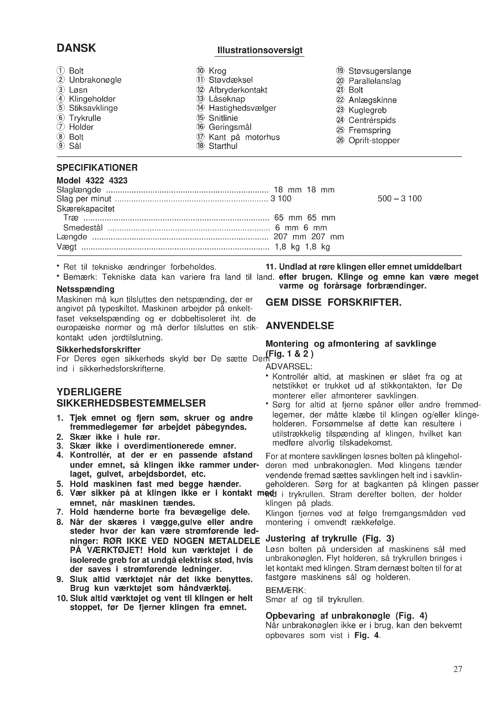 Sorg for altid at fjerne spaner erler andre fremmedlegemer, der matte klæbe til klingen og/eller klingeholderen. Forsommelse af dette kan resultere iutilstrækkelig tilspending af klingen, hvilket kan medfrole alvorlig tilskadekomst.