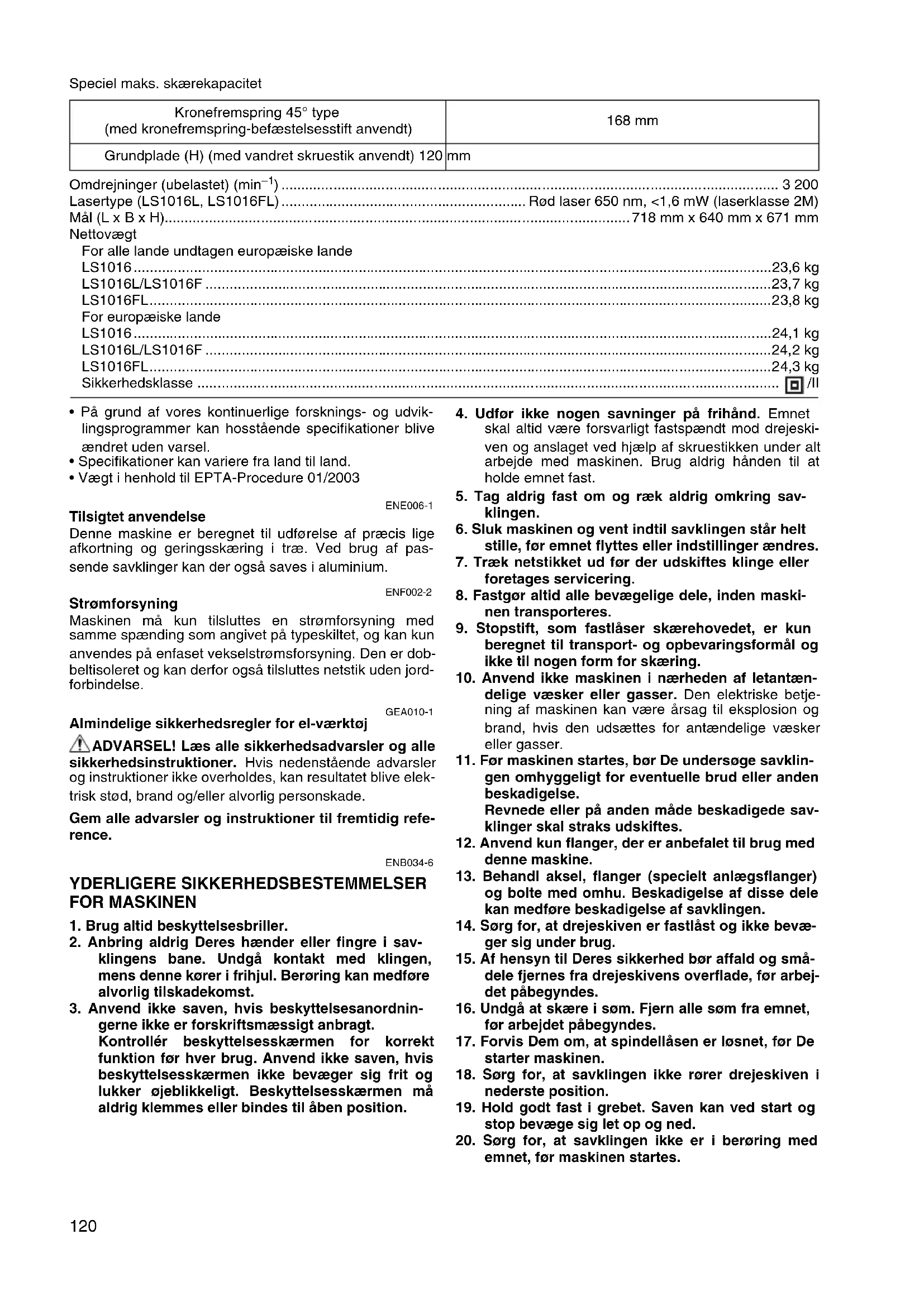 - Vægt i henhold til EPTA-Procedure 01/2003 ENE006-1 Tilsigtet anvendelse Denne maskine er beregnet til udførelse af præcis lige afkortning og geringsskæring i træ. Ved brug af pas- sende savklinger kan der også saves i aluminium. ENF002-2 Strømforsyning Maskinen må kun tilsluttes en strømforsyning med samme spænding som angivet på typeskiltet, og kan kun anvendes på enfaset vekselstrømsforsyning. Den er dob- beltisoleret og kan derfor også tilsluttes netstik uden jord- forbindelse. GEA010-1 Almindelige sikkerhedsregler for el-værktøj ADVARSEL! Læs alle sikkerhedsadvarsler og alle sikkerhedsinstruktioner. Hvis nedenstående advarsler og instruktioner ikke overholdes, kan resultatet blive elek- trisk stød, brand og/eller alvorlig personskade. Gem alle advarsler og instruktioner til fremtidig refe- rence. ENB034-6 YDERLIGERE SIKKERHEDSBESTEMMELSER FOR MASKINEN
