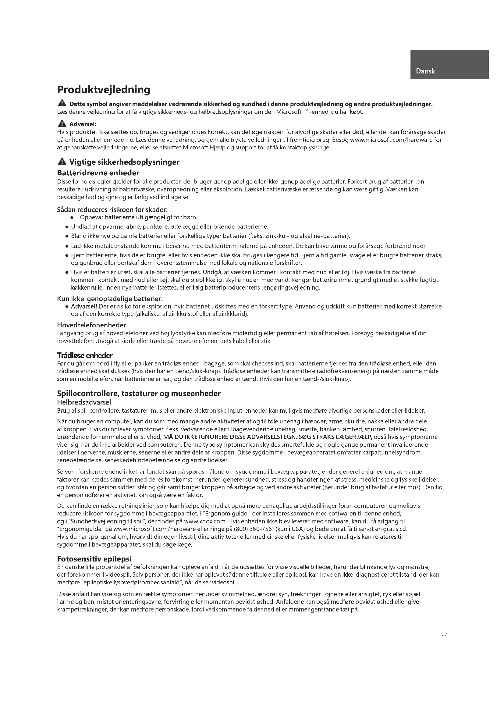 -enhed, du har købt. Advarsel: Hvis produktet ikke sættes op, bruges og vedligeholdes korrekt, kan det øge risikoen for alvorlige skader eller død, eller det kan forårsage skader på enheden eller enhederne. Læs denne vejledning, og gem alle trykte vejledninger til fremtidig brug. Besøg www.microsoft.com/hardware for at genanskaffe vejledningerne, eller se afsnittet Microsoft Hjælp og support for at få kontaktoplysninger. Vigtige sikkerhedsoplysninger Batteridrevne enheder Disse forholdsregler gælder for alle produkter, der bruger genopladelige eller ikke-genopladelige batterier. Forkert brug af batterier kan resultere i udsivning af batterivæske, overophedning eller eksplosion. Lækket batterivæske er ætsende og kan være giftig. Væsken kan beskadige hud og øjne og er farlig ved indtagelse. Sådan reduceres risikoen for skader: ● Opbevar batterierne utilgængeligt for børn. ● Undlad at opvarme, åbne, punktere, ødelægge eller brænde batterierne. ● Bland ikke nye og gamle batterier eller forskellige typer batterier (f.eks. zink-kul- og alkaline-batterier). ● Lad ikke metalgenstande komme i berøring med batteriterminalerne på enheden. De kan blive varme og forårsage forbrændinger. ● Fjern batterierne, hvis de er brugte, eller hvis enheden ikke skal bruges i længere tid. Fjern altid gamle, svage eller brugte batterier straks, og genbrug eller bortskaf dem i overensstemmelse med lokale og nationale forskrifter. ● Hvis et batteri er utæt, skal alle batterier fjernes. Undgå, at væsken kommer i kontakt med hud eller tøj. Hvis væske fra batteriet kommer i kontakt med hud eller tøj, skal du øjeblikkeligt skylle huden med vand. Rengør batterirummet grundigt med et stykke fugtigt køkkenrulle, inden nye batterier isættes, eller følg batteriproducentens rengøringsvejledning. Kun ikke-genopladelige batterier: ● Advarsel! Der er risiko for eksplosion, hvis batteriet udskiftes med en forkert type. Anvend og udskift kun batterier med korrekt størrelse og af den korrekte type (alkaliske, af zinkkulstof eller af zinkklorid). Hovedtelefonenheder Langvarig brug af hovedtelefoner ved høj lydstyrke kan medføre midlertidig eller permanent tab af hørelsen. Forebyg beskadigelse af din hovedtelefon: Undgå at sidde eller træde på hovedtelefonen, dets kabel eller stik. Trådløse enheder Før du går om bord i fl y eller pakker en trådløs enhed i bagage, som skal checkes ind, skal batterierne fjernes fra den trådløse enhed, eller den trådløse enhed skal slukkes (hvis den har en tænd/sluk-knap). Trådløse enheder kan transmittere radiofrekvensenergi på næsten samme måde som en mobiltelefon, når batterierne er isat, og den trådløse enhed er tændt (hvis den har en tænd-/sluk-knap). Spillecontrollere, tastaturer og museenheder Helbredsadvarsel Brug af spil-controllere, tastaturer, mus eller andre elektroniske input-enheder kan muligvis medføre alvorlige personskader eller lidelser. Når du bruger en computer, kan du som med mange andre aktiviteter af og til føle ubehag i hænder, arme, skuldre, nakke eller andre dele af kroppen. Hvis du oplever symptomer, f.eks. vedvarende eller tilbagevendende ubehag, smerte, banken, ømhed, snurren, følelsesløshed, brændende fornemmelse eller stivhed, MÅ DU IKKE IGNORERE DISSE ADVARSELSTEGN. SØG STRAKS LÆGEHJÆLP, også hvis symptomerne viser sig, når du ikke arbejder ved computeren. Denne type symptomer kan skyldes smertefulde og nogle gange permanent invaliderende lidelser i nerverne, musklerne, senerne eller andre dele af kroppen. Disse sygdomme i bevægeapparatet omfatter karpaltunnelsyndrom, senebetændelse, seneskedehindebetændelse og andre lidelser. Selvom forskerne endnu ikke har fundet svar på spørgsmålene om sygdomme i bevægeapparatet, er der generel enighed om, at mange faktorer kan kædes sammen med deres forekomst, herunder: generel sundhed, stress og håndteringen af stress, medicinske og fysiske lidelser, og hvordan en person sidder, står og går samt bruger kroppen på arbejde og ved andre aktiviteter (herunder brug af tastatur eller mus). Den tid, en person udfører en aktivitet, kan også være en faktor. Du kan fi nde en række retningslinjer, som kan hjælpe dig med at opnå mere behagelige arbejdsstillinger foran computeren og muligvis reducere risikoen for sygdomme i bevægeapparatet, i ”Ergonomiguide”, der installeres sammen med softwaren til denne enhed, og i ”Sundhedsvejledning til spil”, der fi ndes på www.xbox.com. Hvis enheden ikke blev leveret med software, kan du få adgang til ”Ergonomiguide” på www.microsoft.com/hardware eller ringe på (800) 360-7561 (kun i USA) og bede om at få tilsendt en gratis cd. Hvis du har spørgsmål om, hvorvidt din egen livsstil, dine aktiviteter eller medicinske eller fysiske lidelser muligvis kan relateres til sygdomme i bevægeapparatet, skal du søge læge. Fotosensitiv epilepsi En ganske lille procentdel af befolkningen kan opleve anfald, når de udsættes for visse visuelle billeder, herunder blinkende lys og mønstre, der forekommer i videospil. Selv personer, der ikke har oplevet sådanne tilfælde eller epilepsi, kan have en ikke-diagnosticeret tilstand, der kan medføre ”epileptiske lysoverfølsomhedsanfald”, når de ser videospil. Disse anfald kan vise sig som en række symptomer, herunder svimmelhed, ændret syn, trækninger i øjnene eller ansigtet, ryk eller spjæt i arme og ben, mistet orienteringsevne, forvirring eller momentan bevidstløshed. Anfaldene kan også medføre bevidstløshed eller give krampetrækninger, der kan medføre personskade, fordi vedkommende falder ned eller rammer genstande tæt på. Dansk38 Stop med det samme med at spille, og konsulter en læge, hvis du oplever nogle af disse symptomer. Forældre skal holde øje med eller udspørge deres børn om de ovenstående symptomer – børn og teenagere har større sandsynlighed for at opleve disse anfald end voksne. Risikoen for epilepti