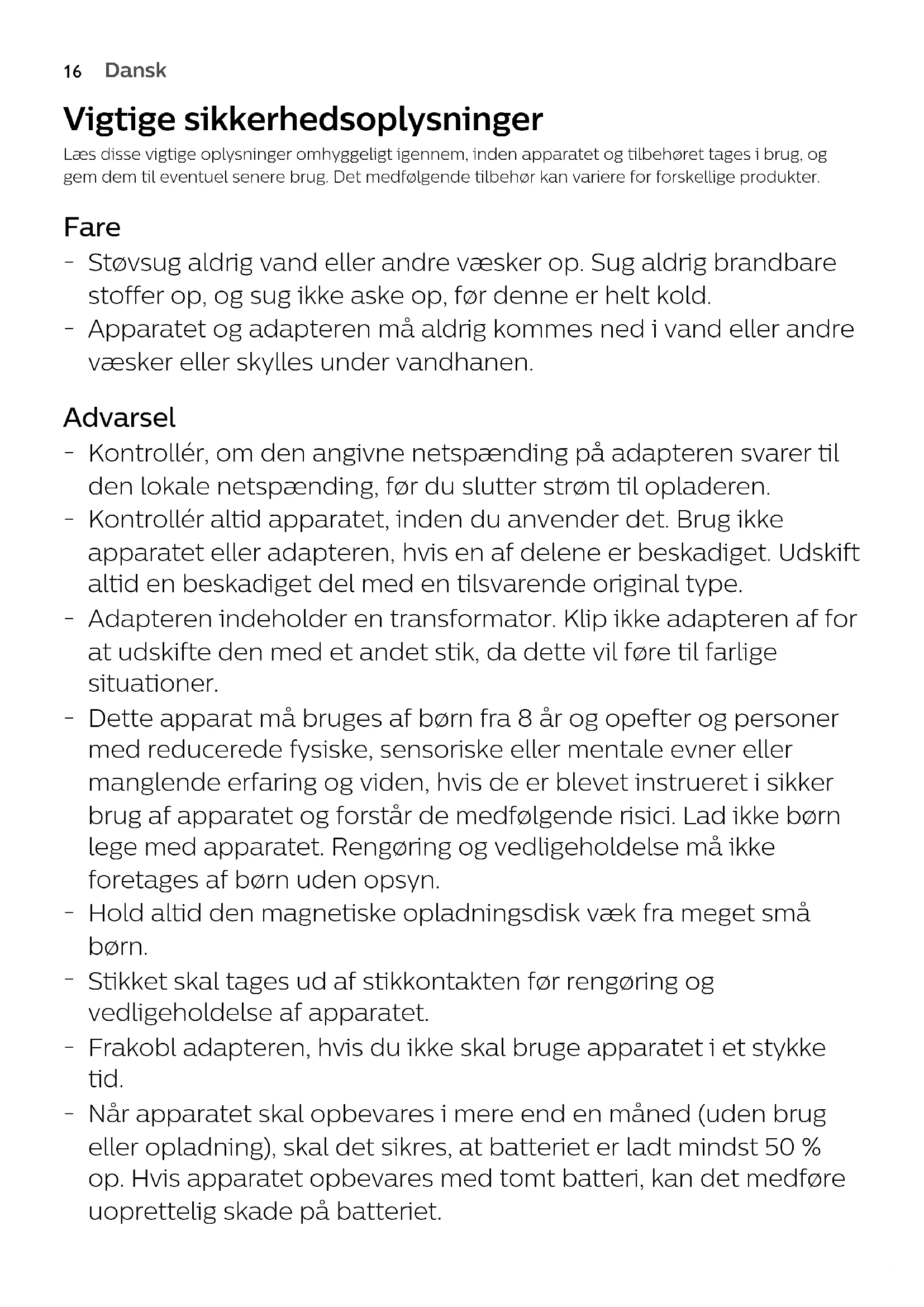 Støvsug aldrig vand eller andre væsker op. Sug aldrig brandbare stoffer op, og sug ikke aske op, før denne er helt kold.