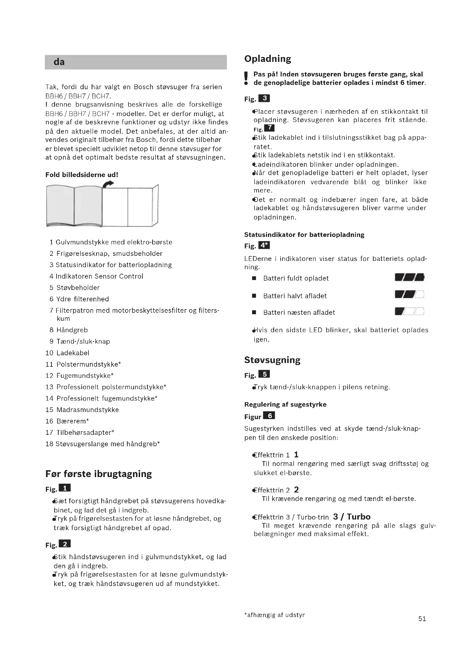 Tak, fordi du har valgt en Bosch støvsuger fra serien BBH6 / BBH7 / BCH7. I denne brugsanvisning beskrives alle de forskellige BBH6 / BBH7 / BCH7 - modeller. Det er derfor muligt, at nogle af de beskrevne funktioner og udstyr ikke findes på den aktuelle model. Det anbefales, at der altid an- vendes originalt tilbehør fra Bosch, fordi dette tilbehør er blevet specielt udviklet netop til denne støvsuger for at opnå det optimalt bedste resultat af støvsugningen. Fold billedsiderne ud! 1 Gulvmundstykke med elektro-børste 2 Frigørelsesknap, smudsbeholder 3 Statusindikator for batteriopladning 4 Indikatoren Sensor Control 5 Støvbeholder 6 Ydre filterenhed 7 Filterpatron med motorbeskyttelsesfilter og filters- kum 8 Håndgreb 9 Tænd-/sluk-knap 10 Ladekabel 11 Polstermundstykke* 12 Fugemundstykke* 13 Professionelt polstermundstykke* 14 Professionelt fugemundstykke* 15 Madrasmundstykke 16 Bærerem* 17 Tilbehørsadapter* 18 Støvsugerslange med håndgreb* Før første ibrugtagning Fig.