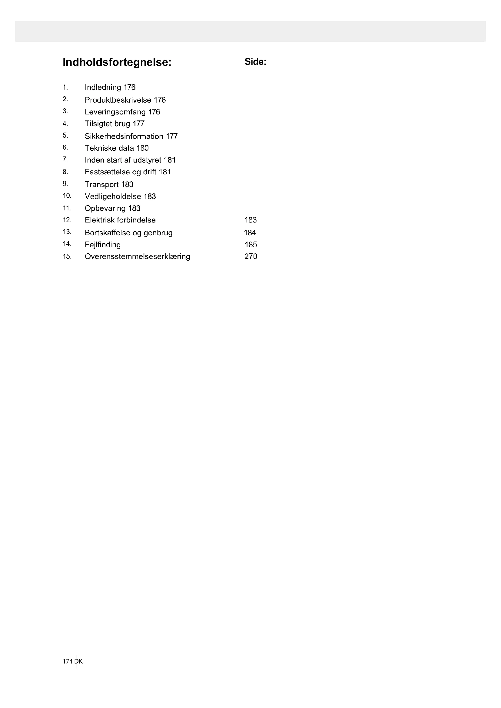 Udstyret leveres i emballage for at forhindre det i at blive beskadiget under transporten. Råvarerne i denne em- ballage kan genbruges eller genanvendes. Udstyret og dets tilbehør er lavet af forskellige typer af materialer, såsom metal og plast. Defekte komponenter skal bort- skaffes som farligt affald. Spørg din forhandler eller din kommune.185DK