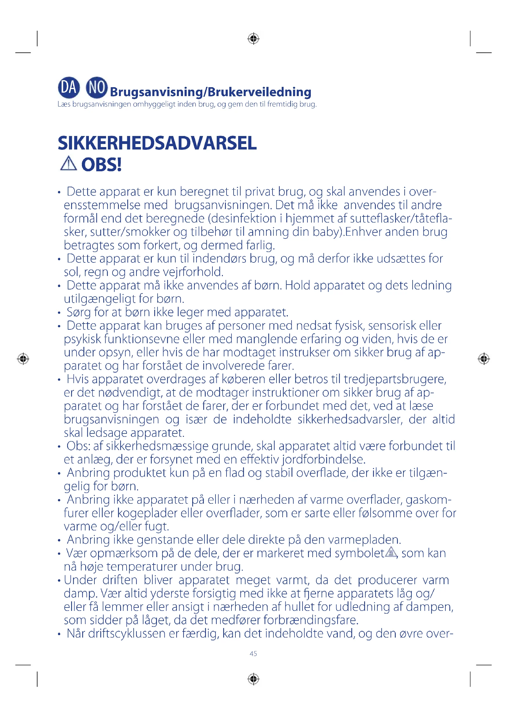 Brugsanvisning/Brukerveiledning Læs brugsanvisningen omhyggeligt inden brug, og gem den til fremtidig brug. SIKKERHEDSADVARSEL OBS!