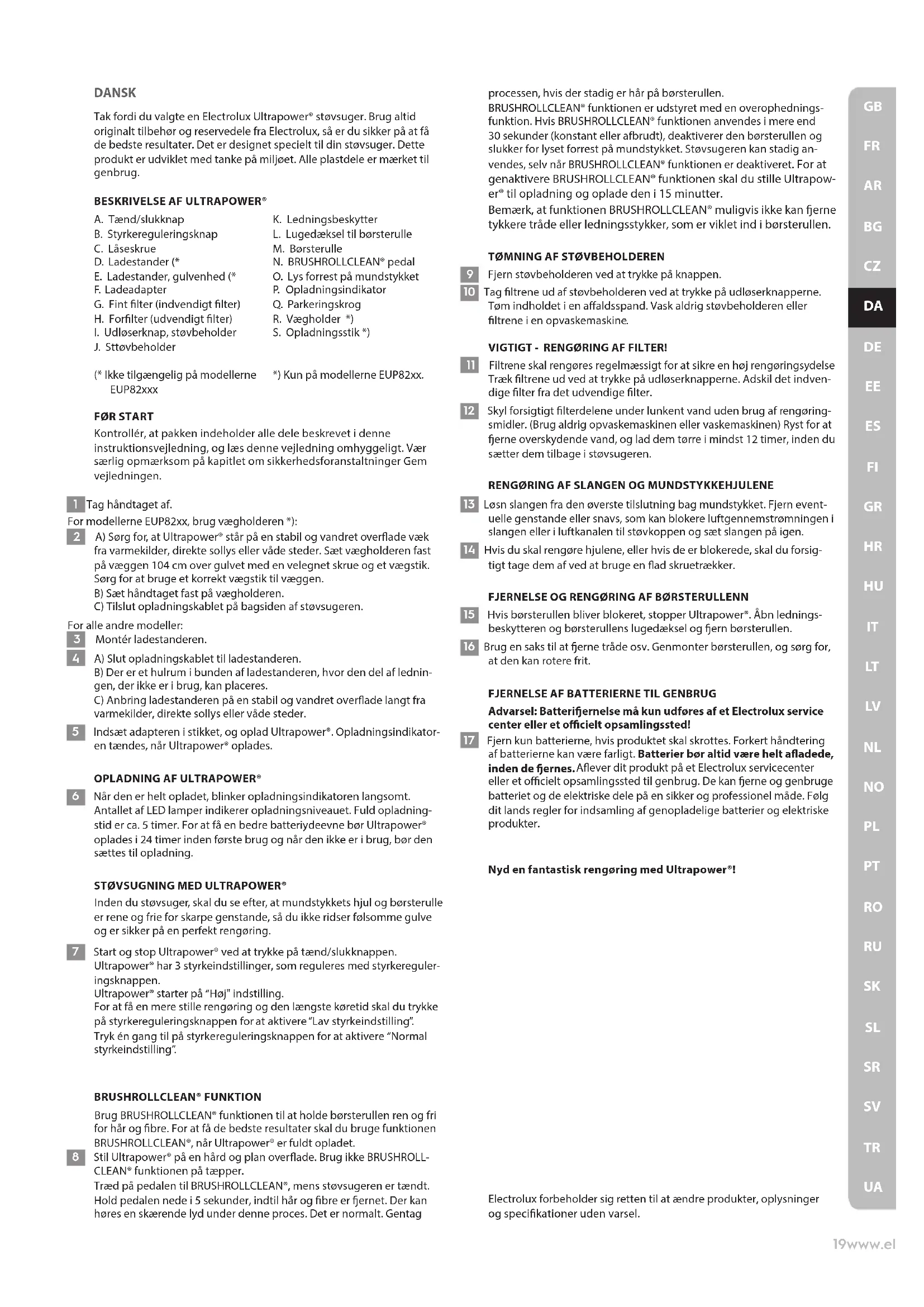 DANSK Tak fordi du valgte en Electrolux Ultrapower® støvsuger. Brug altid originalt tilbehør og reservedele fra Electrolux, så er du sikker på at få de bedste resultater. Det er designet specielt til din støvsuger. Dette produkt er udviklet med tanke på miljøet. Alle plastdele er mærket til genbrug.