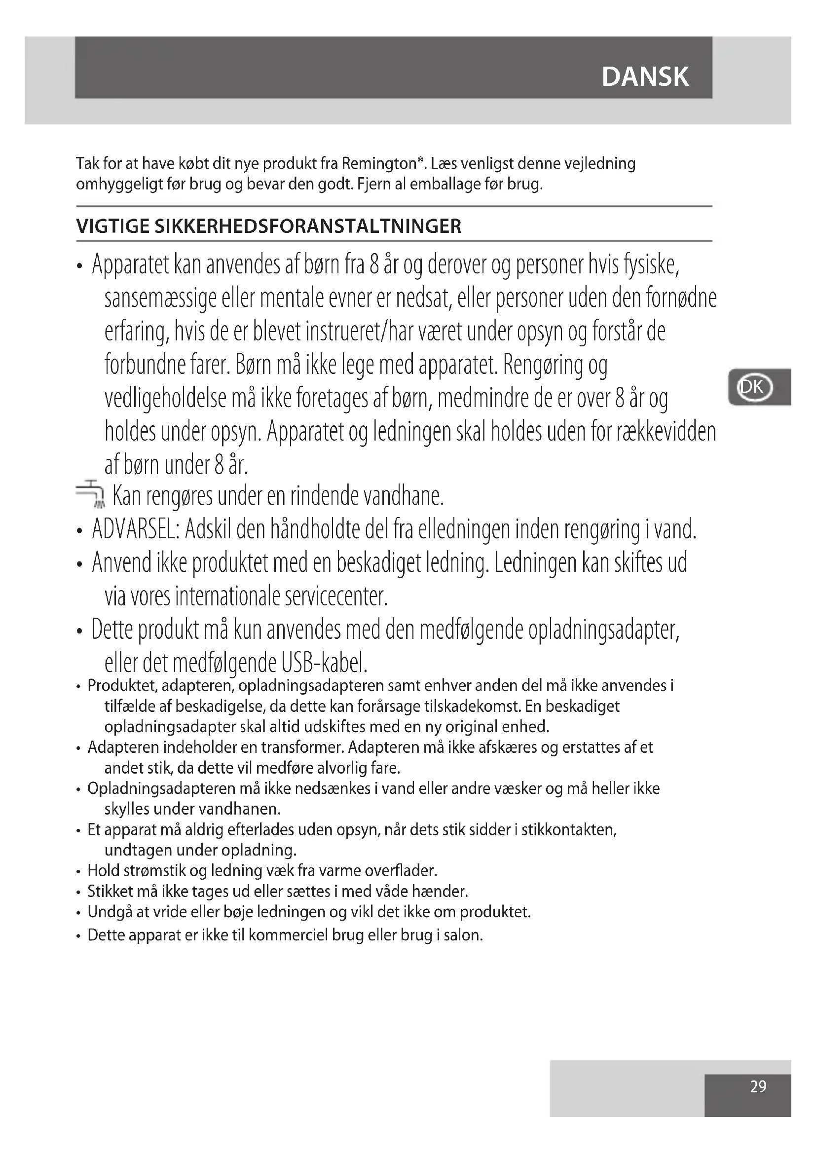 Tak for at have kocht dit nye produit fra Remington. Laes venligst donne vegledning omhyggeligt før brug og bevar den godt. Fjern al emballage før brug.