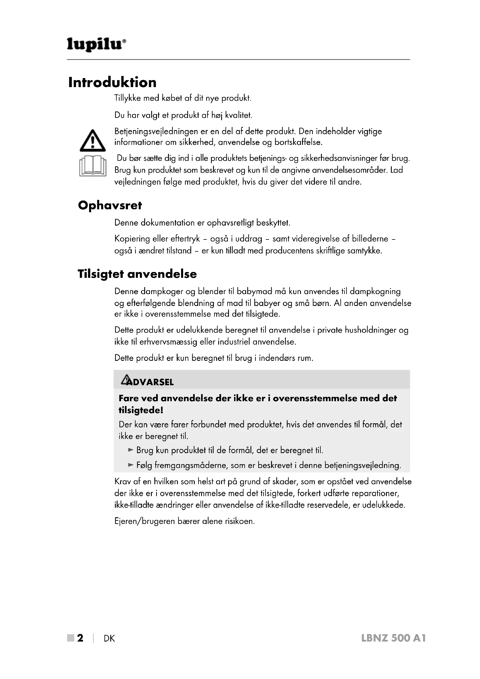 DK LBNZ 500 A1 Introduktion Tillykke med købet af dit nye produkt. Du har valgt et produkt af høj kvalitet. Betjeningsvejledningen er en del af dette produkt. Den indeholder vigtige informationer om sikkerhed, anvendelse og bortskaffelse. Du bør sætte dig ind i alle produktets betjenings- og sikkerhedsanvisninger før brug. Brug kun produktet som beskrevet og kun til de angivne anvendelsesområder. Lad vejledningen følge med produktet, hvis du giver det videre til andre. Ophavsret Denne dokumentation er ophavsretligt beskyttet. Kopiering eller eftertryk – også i uddrag – samt videregivelse af billederne – også i ændret tilstand – er kun tilladt med producentens skriftlige samtykke. Tilsigtet anvendelse Denne dampkoger og blender til babymad må kun anvendes til dampkogning og efterfølgende blendning af mad til babyer og små børn. Al anden anvendelse er ikke i overensstemmelse med det tilsigtede. Dette produkt er udelukkende beregnet til anvendelse i private husholdninger og ikke til erhvervsmæssig eller industriel anvendelse. Dette produkt er kun beregnet til brug i indendørs rum. ADVARSEL Fare ved anvendelse der ikke er i overensstemmelse med det tilsigtede! Der kan være farer forbundet med produktet, hvis det anvendes til formål, det ikke er beregnet til. ► Brug kun produktet til de formål, det er beregnet til. ► Følg fremgangsmåderne, som er beskrevet i denne betjeningsvejledning. Krav af en hvilken som helst art på grund af skader, som er opstået ved anvendelse der ikke er i overensstemmelse med det tilsigtede, forkert udførte reparationer, ikke-tilladte ændringer eller anvendelse af ikke-tilladte reservedele, er udelukkede. Ejeren/brugeren bærer alene risikoen.DK