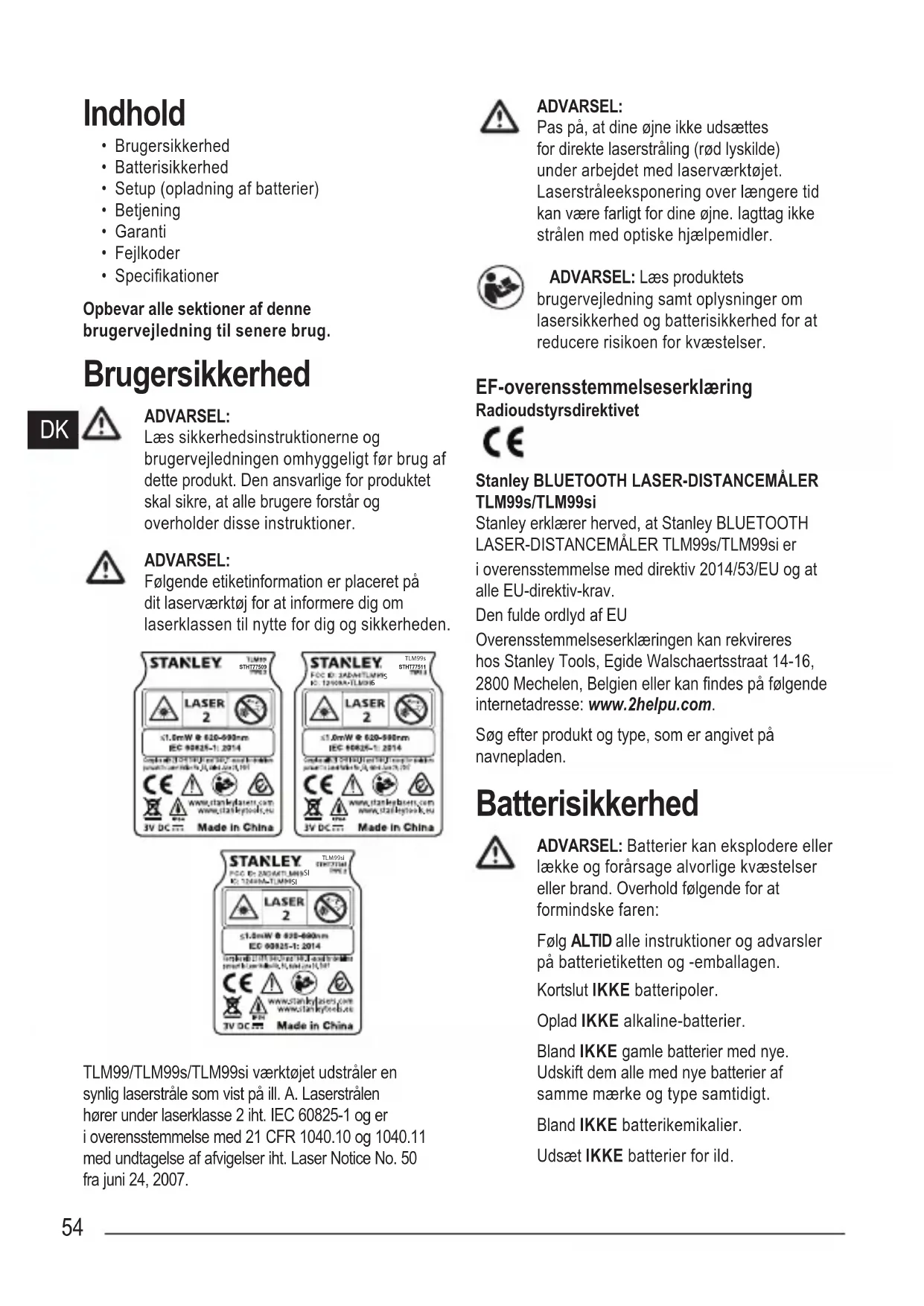 TLM99si TLM99/TLM99s/TLM99si værktøjet udstråler en synlig laserstråle som vist på ill. A. Laserstrålen hører under laserklasse 2 iht. IEC 60825-1 og er i overensstemmelse med 21 CFR 1040.10 og 1040.11 med undtagelse af afvigelser iht. Laser Notice No. 50 fra juni 24, 2007.ADVARSEL:Pas på, at dine øjne ikke udsættes for direkte laserstråling (rød lyskilde) under arbejdet med laserværktøjet. Laserstråleeksponering over længere tid kan være farligt for dine øjne. Iagttag ikke strålen med optiske hjælpemidler. ADVARSEL: Læs produktets brugervejledning samt oplysninger om lasersikkerhed og batterisikkerhed for at reducere risikoen for kvæstelser. EF-overensstemmelseserklæring RadioudstyrsdirektivetStanley BLUETOOTH LASER-DISTANCEMÅLERTLM99s/TLM99siStanley erklærer herved, at Stanley BLUETOOTH LASER-DISTANCEMÅLER TLM99s/TLM99si er i overensstemmelse med direktiv 2014/53/EU og at alle EU-direktiv-krav.Den fulde ordlyd af EU Overensstemmelseserklæringen kan rekvireres hos Stanley Tools, Egide Walschaertsstraat 14-16, 2800 Mechelen, Belgien eller kan ndes på følgende internetadresse: www.2helpu.com.Søg efter produkt og type, som er angivet på navnepladen. Batterisikkerhed ADVARSEL: Batterier kan eksplodere eller lække og forårsage alvorlige kvæstelser eller brand. Overhold følgende for at formindske faren:Følg ALTID alle instruktioner og advarsler på batterietiketten og -emballagen. Kortslut IKKE batteripoler. Oplad IKKE alkaline-batterier.Bland IKKE gamle batterier med nye. Udskift dem alle med nye batterier af samme mærke og type samtidigt.Bland IKKE batterikemikalier.Udsæt IKKE batterier for ild.55