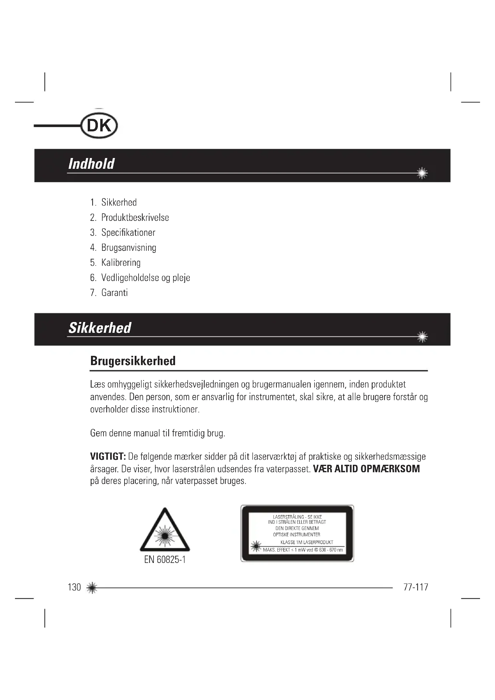 LT LT LT LT TR TR TR HR HR HR HR131 77-117 DER MÅ IKKE fjernes nogen advarselsmærkater fra kabinettet. Dette instrument må kun anvendes til nivellerings- og opmålingsopgaver, som det er beskrevet i denne manual. VÆR ALTID sikker på, at omkringstående personer i nærheden af arbejdsstedet er gjort opmærksomme på faren ved at se direkte ind i laserværktøjet. MÅ IKKE anvendes sammen med andre optiske instrumenter. Instrumentet må ikke ændres, manipuleres eller anvendes til andre formål end dem, der er beskrevet i manualen. SE IKKE ind i strålen med optiske hjælpemidler, så som forstørrelsesglas, kikkerter eller teleskoper. KIG IKKE direkte ind i laserstrålen, og ret den ikke direkte mod andre personer. Sørg for, at instrumentet ikke anbringes i øjenhøjde. Øjnene beskyttes normalt af de naturlige afværgereaktioner så som blinkerefleksen. RET IKKE laserstrålen direkte mod andre personer. SÆT ALTID laserværktøjet på "OFF” (SLUKKET), når det ikke er i brug. Hvis laserværktøjet efterlades på "ON” (TÆNDT), øger det faren for, at nogen ved et uheld kommer til at se ind i laserstrålen. UNDLAD at bruge laserværktøjet på letantændelige steder, f.eks. hvor der findes brændbare væsker, gasser eller støv. UNDLAD at skille laserværktøjet ad. Det indeholder ingen dele, som brugeren kan reparere. Hvis laserværktøjet skilles ad, ophæves alle garantier på værktøjet. Produktet må ikke ændres på nogen måde. Ændringer af laserværktøjet kan føre til strålingsfare. ANVEND IKKE instrumentet på steder, hvor der er fare for en eksplosion. BEMÆRK: Idet laserstrålen er af den fokuserede type, skal strålens bane kontrolleres over en relativ lang afstand, og der skal træffes alle nødvendige forholdsregler for at sikre, at strålen ikke kan ramme andre personer.132 77-117 ADVARSEL: Batterier kan eksplodere eller lække og forårsage skader eller brand. Risikoen herfor kan begrænses: FØLG ALTID alle instruktioner og advarsler på batterimærket og -pakken. UNDLAD at kortslutte batteripolerne. UNDLAD at oplade alkaliske batterier. UNDLAD at blande gamle og nye batterier. Udskift alle batterier med nye batterier af ens mærke og type på én gang. UNDLAD at blande batterier med forskellig type kemi. UNDLAD at brænde batterierne. OPBEVAR ALTID batterier utilgængeligt for børn. FJERN ALTID batterierne, hvis værktøjet ikke skal bruges i flere måneder. BEMÆRK: Sørg for at anvende de korrekte, anbefalede batterier. BEMÆRK: Sørg for at indsætte batterierne korrekt og med korrekt polaritet. UNDLAD AT kassere dette produkt sammen med husholdningsaffald. AFHÆND ALTID batterierne i overensstemmelse med lokale love. GENBRUG VENLIGST i overensstemmelse med de lokale bestemmelser for indsamling og bortskaffelse af elektrisk og elektronisk affald iflg. WEEE-direktivet. Batterisikkerhed Efter endt brugstid133 77-117