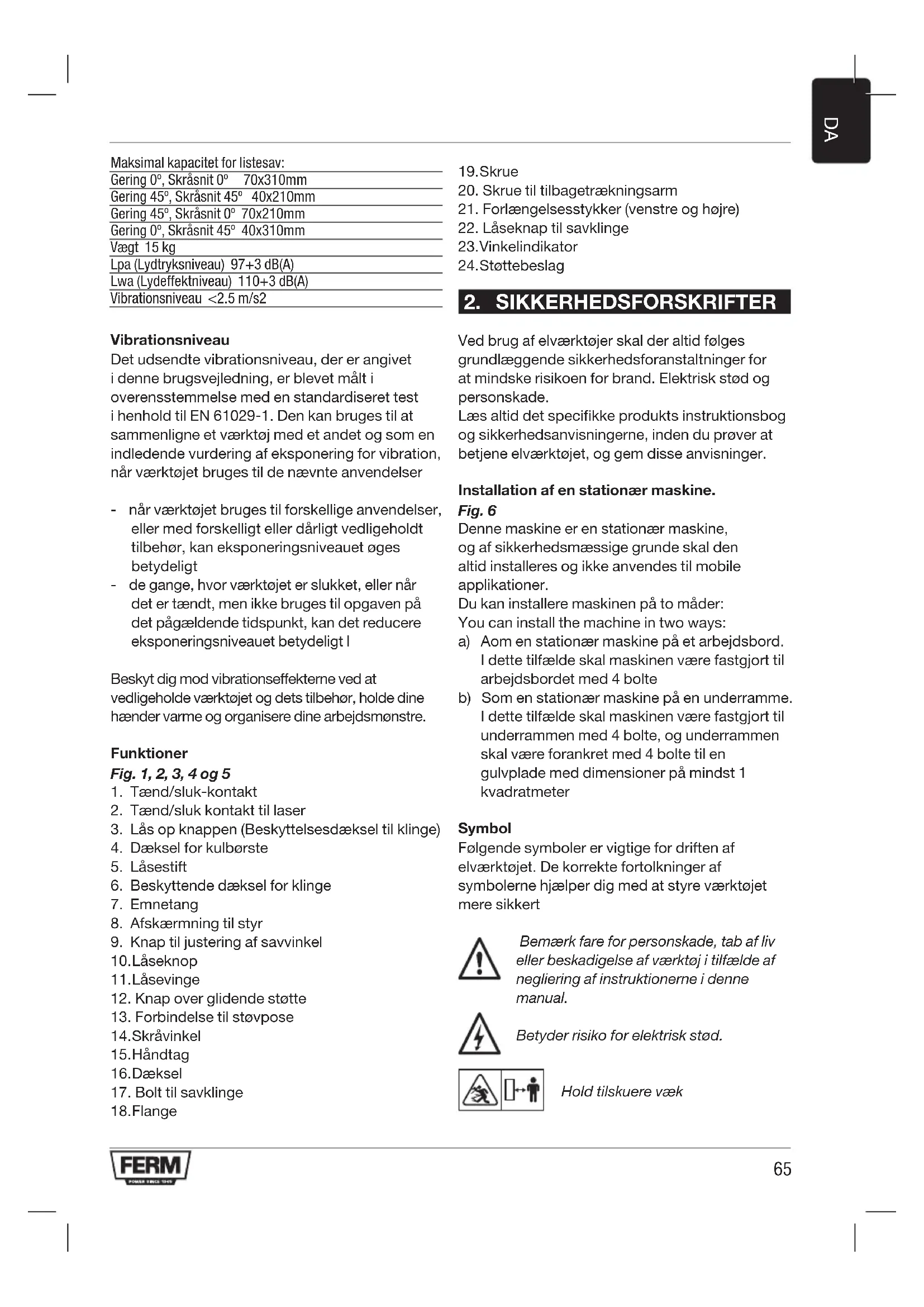 Ved brug af elværktøjer skal der altid følges grundlæggende sikkerhedsforanstaltninger for at mindske risikoen for brand. Elektrisk stød og personskade. Læs altid det specifikke produkts instruktionsbog og sikkerhedsanvisningerne, inden du prøver at betjene elværktøjet, og gem disse anvisninger. Installation af en stationær maskine. Fig. 6 Denne maskine er en stationær maskine, og af sikkerhedsmæssige grunde skal den altid installeres og ikke anvendes til mobile applikationer. Du kan installere maskinen på to måder: You can install the machine in two ways: a) Aom en stationær maskine på et arbejdsbord. I dette tilfælde skal maskinen være fastgjort til arbejdsbordet med 4 bolte b) Som en stationær maskine på en underramme. I dette tilfælde skal maskinen være fastgjort til underrammen med 4 bolte, og underrammen skal være forankret med 4 bolte til en gulvplade med dimensioner på mindst 1 kvadratmeter Symbol Følgende symboler er vigtige for driften af elværktøjet. De korrekte fortolkninger af symbolerne hjælper dig med at styre værktøjet mere sikkert Bemærk fare for personskade, tab af liv eller beskadigelse af værktøj i tilfælde af negliering af instruktionerne i denne manual. Betyder risiko for elektrisk stød. Hold tilskuere væk66