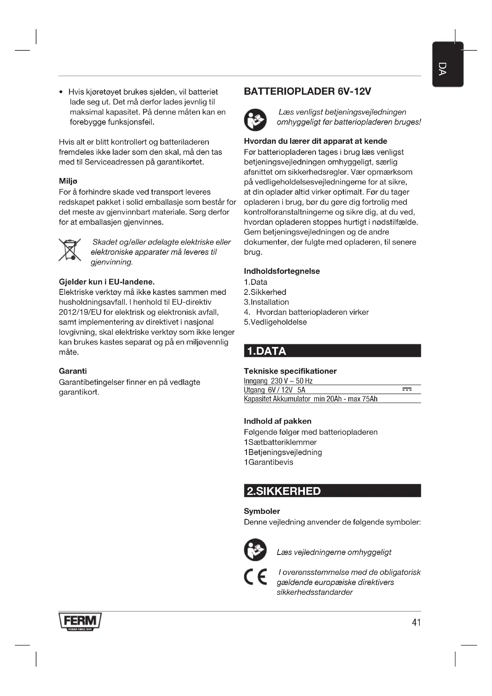 - Hvis køretøjet bruges sjældent, vil batteriet være afladet. Det er derfor nødvendigt at oplade det jævnligt til fuld kapacitet. På den måde kan funktionsfejl undgås. Hvis alt er blevet kontrolleret, og batteriopladeren stadig ikke oplader, som den skulle, er det nødvendigt at tage den med til den serviceadresse, som står på garantibeviset. Miljø For at forhindre beskadigelse under transporten, afleveres apparatet solidt emballeret i materialer, som for det meste kan genbruges. Benyt derfor venligst mulighederne for genbrug af emballagen. Defekte og/eller kasserede elektriske eller elektroniske apparater skal afleveres til pågældende genbrugsstationer. Kun for EU-lande Smid ikke el-værktøjer ud sammen med almindeligt affald. I henhold til de europæiske direktiver 2012/19/EU for elektrisk og elektronisk udstyr og er implementeret i henhold til nationale rettigheder, el-værktøj som ikke længere er anvendelig skal indsamles separat og genbruges på en miljøvenlig måde. Garantibevis Med hensyn til garantibetingelserne, refereres til garantibeviset, der følger separat med.