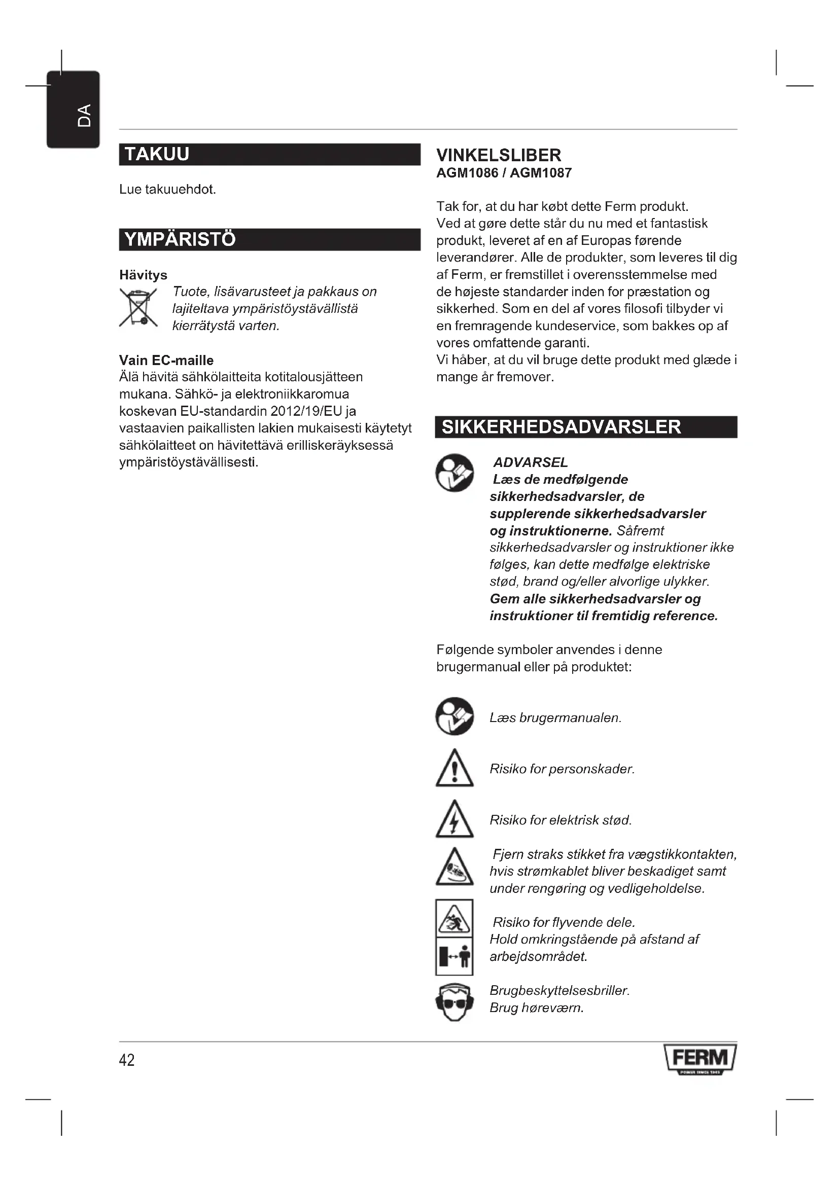TAKUU Lue takuuehdot. YMPÄRISTÖ Hävitys Tuote, lisävarusteet ja pakkaus on lajiteltava ympäristöystävällistä kierrätystä varten. Vain EC-maille Älä hävitä sähkölaitteita kotitalousjätteen mukana. Sähkö- ja elektroniikkaromua koskevan EU-standardin 2012/19/EU ja vastaavien paikallisten lakien mukaisesti käytetyt sähkölaitteet on hävitettävä erilliskeräyksessä ympäristöystävällisesti. VINKELSLIBER AGM1086 / AGM1087 Tak for, at du har købt dette Ferm produkt. Ved at gøre dette står du nu med et fantastisk produkt, leveret af en af Europas førende leverandører. Alle de produkter, som leveres til dig af Ferm, er fremstillet i overensstemmelse med de højeste standarder inden for præstation og sikkerhed. Som en del af vores filosofi tilbyder vi en fremragende kundeservice, som bakkes op af vores omfattende garanti. Vi håber, at du vil bruge dette produkt med glæde i mange år fremover. SIKKERHEDSADVARSLER ADVARSEL Læs de medfølgende sikkerhedsadvarsler, de supplerende sikkerhedsadvarsler og instruktionerne. Såfremt sikkerhedsadvarsler og instruktioner ikke følges, kan dette medfølge elektriske stød, brand og/eller alvorlige ulykker. Gem alle sikkerhedsadvarsler og instruktioner til fremtidig reference. Følgende symboler anvendes i denne brugermanual eller på produktet: Læs brugermanualen. Risiko for personskader. Risiko for elektrisk stød. Fjern straks stikket fra vægstikkontakten, hvis strømkablet bliver beskadiget samt under rengøring og vedligeholdelse. Risiko for flyvende dele. Hold omkringstående på afstand af arbejdsområdet. Brug beskyttelsesbriller. Brug høreværn.43