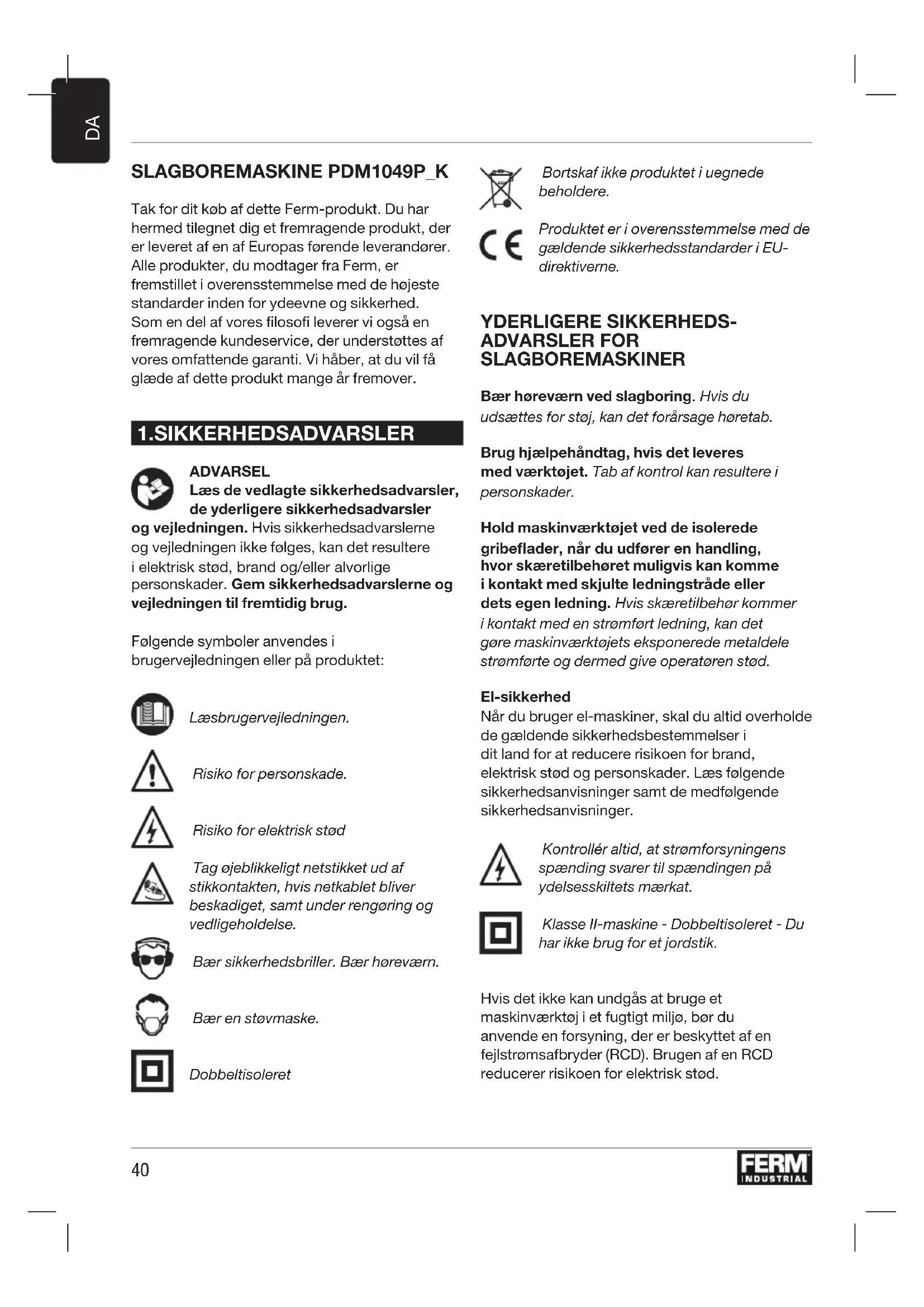 ADVARSEL Læs de vedlagte sikkerhedsadvarsler, de yderligere sikkerhedsadvarsler og vejledningen. Hvis sikkerhedsadvarslerne og vejledningen ikke følges, kan det resultere i elektrisk stød, brand og/eller alvorlige personskader. Gem sikkerhedsadvarslerne og vejledningen til fremtidig brug. Følgende symboler anvendes i brugervejledningen eller på produktet: Læs brugervejledningen. Risiko for personskade. Risiko for elektrisk stød Tag øjeblikkeligt netstikket ud af stikkontakten, hvis netkablet bliver beskadiget, samt under rengøring og vedligeholdelse. Bær sikkerhedsbriller. Bær høreværn. Bær en støvmaske. Dobbeltisoleret Bortskaf ikke produktet i uegnede beholdere. Produktet er i overensstemmelse med de gældende sikkerhedsstandarder i EU- direktiverne. YDERLIGERE SIKKERHEDS- ADVARSLER FOR SLAGBOREMASKINER Bær høreværn ved slagboring. Hvis du udsættes for støj, kan det forårsage høretab. Brug hjælpehåndtag, hvis det leveres med værktøjet. Tab af kontrol kan resultere i personskader. Hold maskinværktøjet ved de isolerede gribeader, når du udfører en handling, hvor skæretilbehøret muligvis kan komme i kontakt med skjulte ledningstråde eller dets egen ledning. Hvis skæretilbehør kommer i kontakt med en strømført ledning, kan det gøre maskinværktøjets eksponerede metaldele strømførte og dermed give operatøren stød. El-sikkerhed Når du bruger el-maskiner, skal du altid overholde de gældende sikkerhedsbestemmelser i dit land for at reducere risikoen for brand, elektrisk stød og personskader. Læs følgende sikkerhedsanvisninger samt de medfølgende sikkerhedsanvisninger. Kontrollér altid, at strømforsyningens spænding svarer til spændingen på ydelsesskiltets mærkat. Klasse II-maskine - Dobbeltisoleret - Du har ikke brug for et jordstik. Hvis det ikke kan undgås at bruge et maskinværktøj i et fugtigt miljø, bør du anvende en forsyning, der er beskyttet af en fejlstrømsafbryder (RCD). Brugen af en RCD reducerer risikoen for elektrisk stød.41