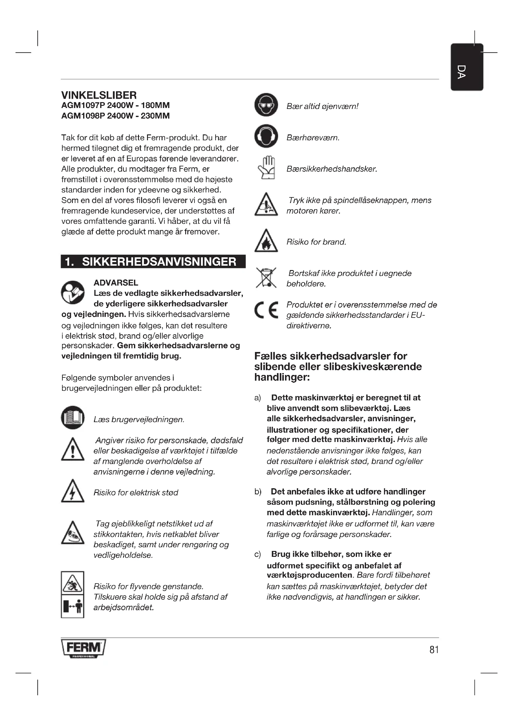 AGM1098P - Elektrisk vinkelsliber Ferm - Gratis brugsanvisning og manual