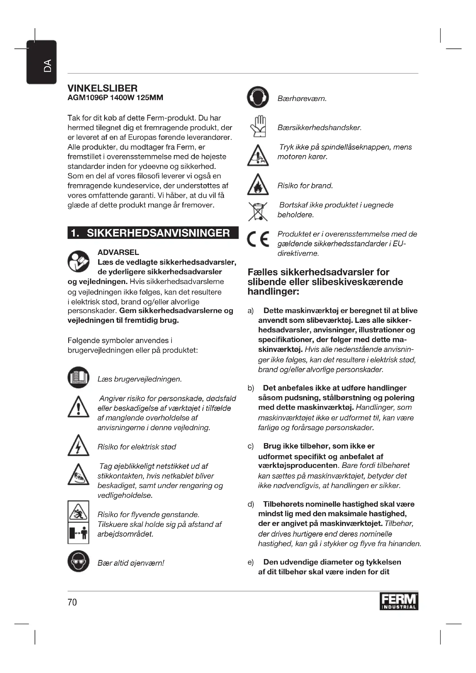 ADVARSEL Læs de vedlagte sikkerhedsadvarsler, de yderligere sikkerhedsadvarsler og vejledningen. Hvis sikkerhedsadvarslerne og vejledningen ikke følges, kan det resultere i elektrisk stød, brand og/eller alvorlige personskader. Gem sikkerhedsadvarslerne og vejledningen til fremtidig brug. Følgende symboler anvendes i brugervejledningen eller på produktet: Læs brugervejledningen. Angiver risiko for personskade, dødsfald eller beskadigelse af værktøjet i tilfælde af manglende overholdelse af anvisningerne i denne vejledning. Risiko for elektrisk stød Tag øjeblikkeligt netstikket ud af stikkontakten, hvis netkablet bliver beskadiget, samt under rengøring og vedligeholdelse. Risiko for flyvende genstande. Tilskuere skal holde sig på afstand af arbejdsområdet. Bær altid øjenværn! Bær høreværn. Bær sikkerhedshandsker. Tryk ikke på spindellåseknappen, mens motoren kører. Risiko for brand. Bortskaf ikke produktet i uegnede beholdere. Produktet er i overensstemmelse med de gældende sikkerhedsstandarder i EU- direktiverne. Fælles sikkerhedsadvarsler for slibende eller slibeskiveskærende handlinger: a) Dette maskinværktøj er beregnet til at blive anvendt som slibeværktøj. Læs alle sikker- hedsadvarsler, anvisninger, illustrationer og specikationer, der følger med dette ma- skinværktøj. Hvis alle nedenstående anvisnin- ger ikke følges, kan det resultere i elektrisk stød, brand og/eller alvorlige personskader. b) Det anbefales ikke at udføre handlinger såsom pudsning, stålbørstning og polering med dette maskinværktøj. Handlinger, som maskinværktøjet ikke er udformet til, kan være farlige og forårsage personskader. c) Brug ikke tilbehør, som ikke er udformet specikt og anbefalet af værktøjsproducenten. Bare fordi tilbehøret kan sættes på maskinværktøjet, betyder det ikke nødvendigvis, at handlingen er sikker. d) Tilbehørets nominelle hastighed skal være mindst lig med den maksimale hastighed, der er angivet på maskinværktøjet. Tilbehør, der drives hurtigere end deres nominelle hastighed, kan gå i stykker og yve fra hinanden. e) Den udvendige diameter og tykkelsen af dit tilbehør skal være inden for dit71