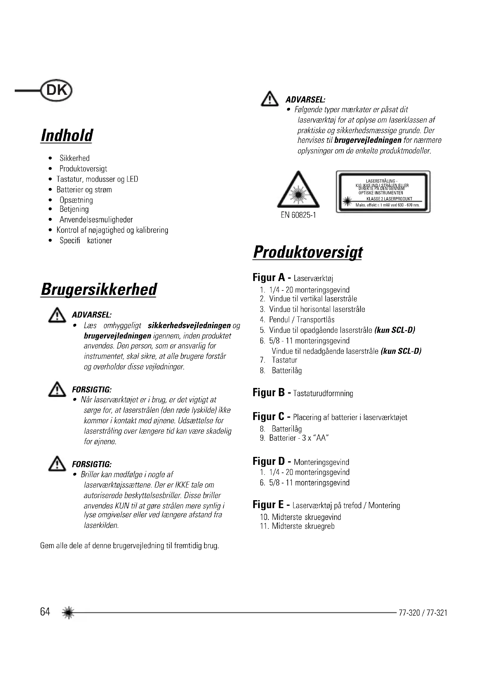 - Følgende typer mærkater er påsat dit laserværktøj for at oplyse om laserklassen af praktiske og sikkerhedsmæssige grunde. Der henvises til brugervejledningen for nærmere oplysninger om de enkelte produktmodeller. DK65 77-320 / 77-321 Figur F - Pendul / Transportlåsens positioner Figur G - Lasermodusser Figur H - Impulsmodus Figur J - Manual modus) Figur K - Lige stråles nøjagtighed Figur L - Horisontal stråles nøjagtighed Figur M - Vertikal stråles nøjagtighed Figur N - Nøjagtighed af opadgående og nedadgående stråle Tastatur, modusser og LED Tastaturer (Se fi gur