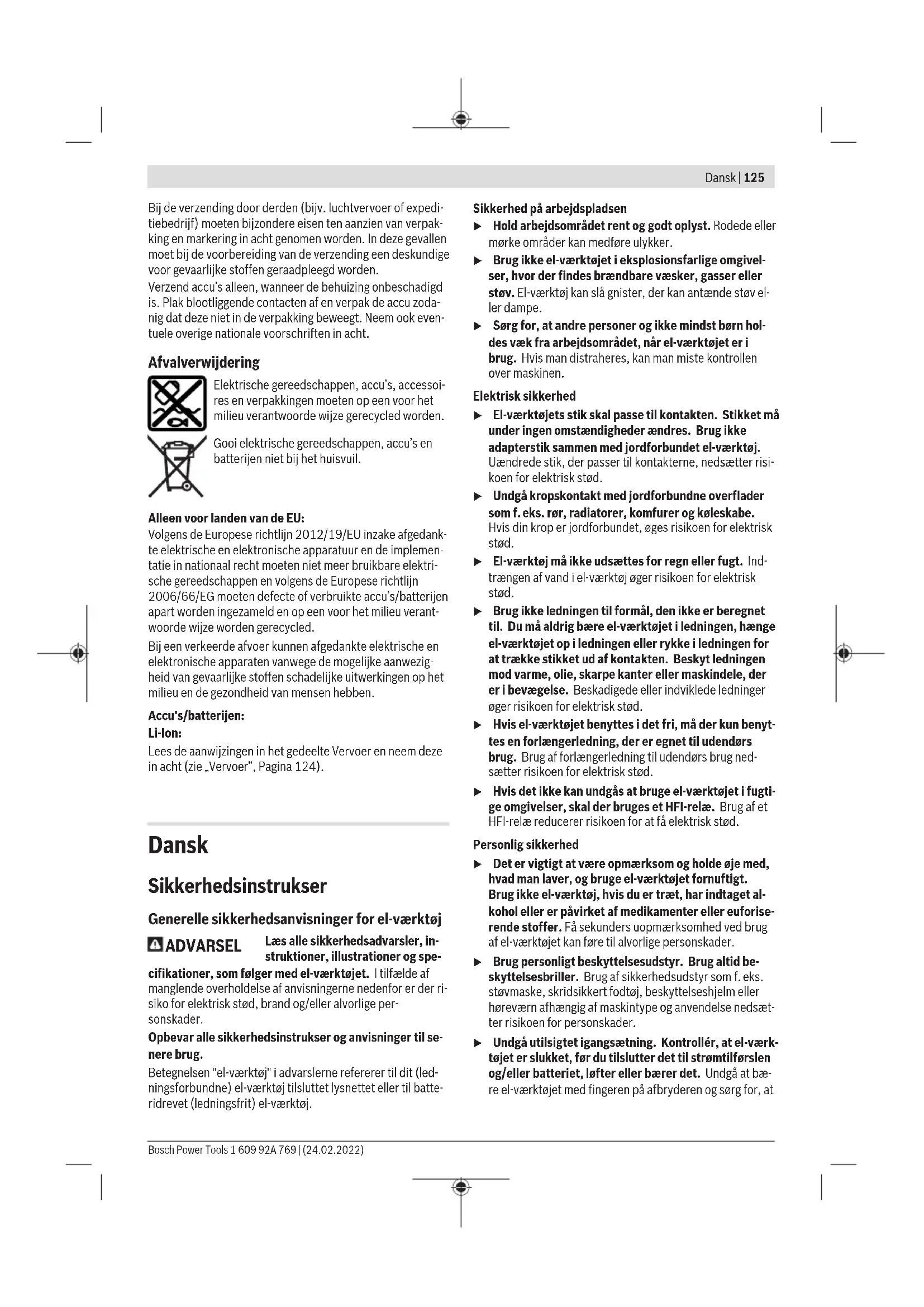 Connectivity-functies (GWS 18V-10 SC / GWS 18V-10 PC/ GWS18V-10PSC) In combinatie met de Bluetooth® Low Energy Module GCY42 staan de volgende Connectivity-functies voor het elektrische gereedschap ter beschikking: – registratie en persoonlijke instelling – statuscontrole, geven van waarschuwingsmeldingen – algemene informatie en instellingen – beheer Lees voor informatie over de Bluetooth® Low Energy Module GCY42 de bijbehorende gebruiksaanwijzing. Onderhoud en service Onderhoud en reiniging u Neem vóór alle werkzaamheden aan het elektrische gereedschap (zoals het uitvoeren van onderhoud of het wisselen van inzetgereedschappen e.d.) en vóór het vervoeren en opbergen altijd de accu uit het elek- trische gereedschap. Bij per ongeluk bedienen van de aan/uit-schakelaar bestaat gevaar voor letsel. u Houd het elektrische gereedschap en de ventilatie- openingen altijd schoon om goed en veilig te werken. Bewaar en behandel de accessoires zorgvuldig. Klantenservice en gebruiksadvies Onze klantenservice beantwoordt uw vragen over reparatie en onderhoud van uw product en over vervangingsonderde- len. Explosietekeningen en informatie over vervangingson- derdelen vindt u ook op: www.bosch-pt.com Het Bosch-gebruiksadviesteam helpt u graag bij vragen over onze producten en accessoires. Vermeld bij vragen en bestellingen van vervangingsonderde- len altijd het uit tien cijfers bestaande productnummer vol- gens het typeplaatje van het product. Nederland Tel.: (076) 579 54 54 Fax: (076) 579 54 94 E-mail: gereedschappen@nl.bosch.com Meer serviceadressen vindt u onder: www.bosch-pt.com/serviceaddresses Vervoer Op de aanbevolen Li-Ion-accu’s zijn de eisen voor het ver- voer van gevaarlijke stoffen van toepassing. De accu’s kun- nen door de gebruiker zonder verdere voorwaarden over de weg vervoerd worden. 1 609 92A 769 | (24.02.2022) Bosch Power ToolsDansk | 125 Bij de verzending door derden (bijv. luchtvervoer of expedi- tiebedrijf) moeten bijzondere eisen ten aanzien van verpak- king en markering in acht genomen worden. In deze gevallen moet bij de voorbereiding van de verzending een deskundige voor gevaarlijke stoffen geraadpleegd worden. Verzend accu’s alleen, wanneer de behuizing onbeschadigd is. Plak blootliggende contacten af en verpak de accu zoda- nig dat deze niet in de verpakking beweegt. Neem ook even- tuele overige nationale voorschriften in acht. Afvalverwijdering Elektrische gereedschappen, accu’s, accessoi- res en verpakkingen moeten op een voor het milieu verantwoorde wijze gerecycled worden. Gooi elektrische gereedschappen, accu’s en batterijen niet bij het huisvuil. Alleen voor landen van de EU: Volgens de Europese richtlijn 2012/19/EU inzake afgedank- te elektrische en elektronische apparatuur en de implemen- tatie in nationaal recht moeten niet meer bruikbare elektri- sche gereedschappen en volgens de Europese richtlijn 2006/66/EG moeten defecte of verbruikte accu’s/batterijen apart worden ingezameld en op een voor het milieu verant- woorde wijze worden gerecycled. Bij een verkeerde afvoer kunnen afgedankte elektrische en elektronische apparaten vanwege de mogelijke aanwezig- heid van gevaarlijke stoffen schadelijke uitwerkingen op het milieu en de gezondheid van mensen hebben. Accu's/batterijen: Li-Ion: Lees de aanwijzingen in het gedeelte Vervoer en neem deze in acht (zie „Vervoer“, Pagina124). Dansk Sikkerhedsinstrukser Generelle sikkerhedsanvisninger for el-værktøj ADVARSEL Læs alle sikkerhedsadvarsler, in- struktioner, illustrationer og spe- cifikationer, som følger med el-værktøjet. I tilfælde af manglende overholdelse af anvisningerne nedenfor er der ri- siko for elektrisk stød, brand og/eller alvorlige per- sonskader. Opbevar alle sikkerhedsinstrukser og anvisninger til se- nere brug. Betegnelsen "el-værktøj" i advarslerne refererer til dit (led- ningsforbundne) el-værktøj tilsluttet lysnettet eller til batte- ridrevet (ledningsfrit) el-værktøj. Sikkerhed på arbejdspladsen u Hold arbejdsområdet rent og godt oplyst. Rodede eller mørke områder kan medføre ulykker. u Brug ikke el‑værktøjet i eksplosionsfarlige omgivel- ser, hvor der findes brændbare væsker, gasser eller støv. El‑værktøj kan slå gnister, der kan antænde støv el- ler dampe. u Sørg for, at andre personer og ikke mindst børn hol- des væk fra arbejdsområdet, når el-værktøjet er i brug. Hvis man distraheres, kan man miste kontrollen over maskinen. Elektrisk sikkerhed u El‑værktøjets stik skal passe til kontakten. Stikket må under ingen omstændigheder ændres. Brug ikke adapterstik sammen med jordforbundet el‑værktøj. Uændrede stik, der passer til kontakterne, nedsætter risi- koen for elektrisk stød. u Undgå kropskontakt med jordforbundne overflader som f. eks. rør, radiatorer, komfurer og køleskabe. Hvis din krop er jordforbundet, øges risikoen for elektrisk stød. u El-værktøj må ikke udsættes for regn eller fugt. Ind- trængen af vand i el‑værktøj øger risikoen for elektrisk stød. u Brug ikke ledningen til formål, den ikke er beregnet til. Du må aldrig bære el‑værktøjet i ledningen, hænge el‑værktøjet op i ledningen eller rykke i ledningen for at trække stikket ud af kontakten. Beskyt ledningen mod varme, olie, skarpe kanter eller maskindele, der er i bevægelse. Beskadigede eller indviklede ledninger øger risikoen for elektrisk stød. u Hvis el‑værktøjet benyttes i det fri, må der kun benyt- tes en forlængerledning, der er egnet til udendørs brug. Brug af forlængerledning til udendørs brug ned- sætter risikoen for elektrisk stød. u Hvis det ikke kan undgås at bruge el‑værktøjet i fugti- ge omgivelser, skal der bruges et HFI‑relæ. Brug af et HFI‑relæ reducerer risikoen for at få elektrisk stød. Personlig sikkerhed u Det er vigtigt at være opmærksom og holde øje med, hvad man laver, og bruge el‑værktøjet fornuftigt. Brug ikke el‑værktøj, hvis du er træt, har indtaget al- kohol e