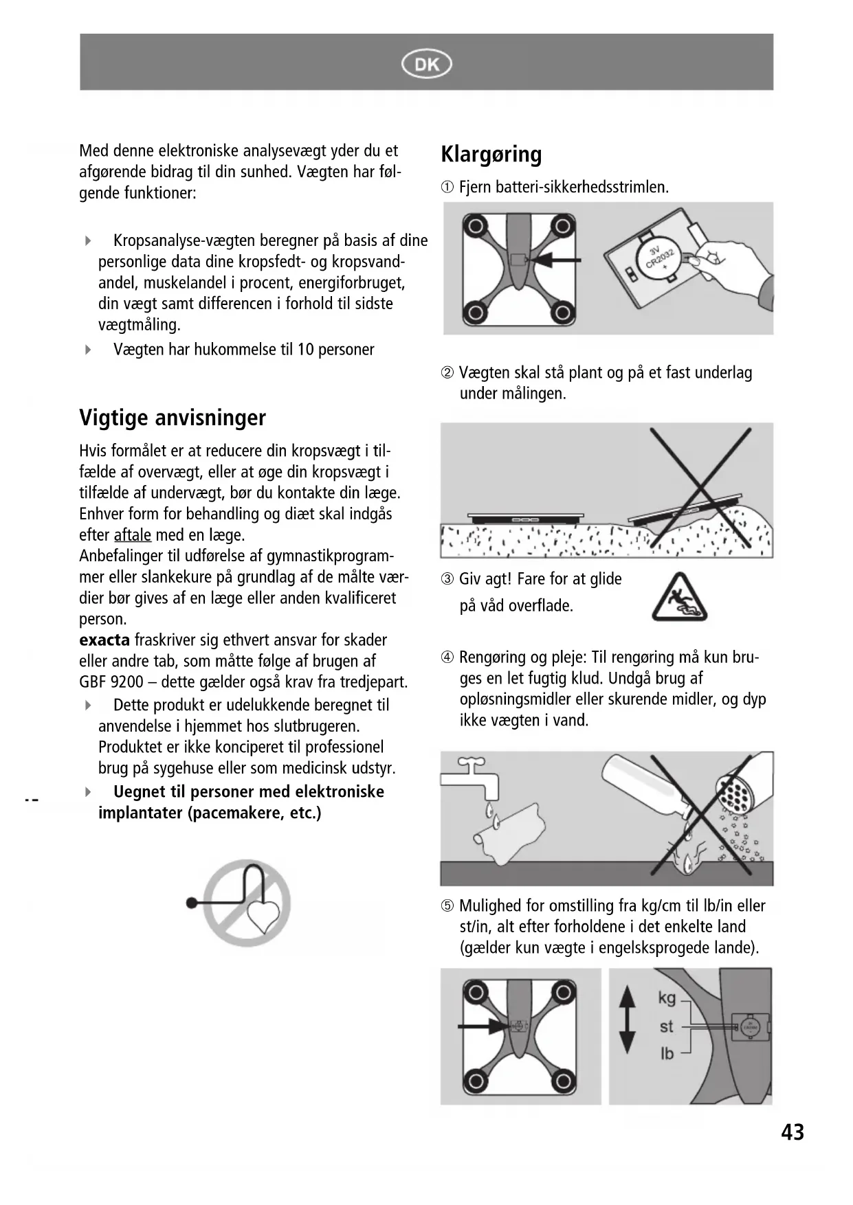 ④ Rengoring og pleje: Til rengoring ma kun bruges en let fugtig klud. Undgå brug af oplosningsmidler eller skurende midler, og dyp/DDke vægten i vand.