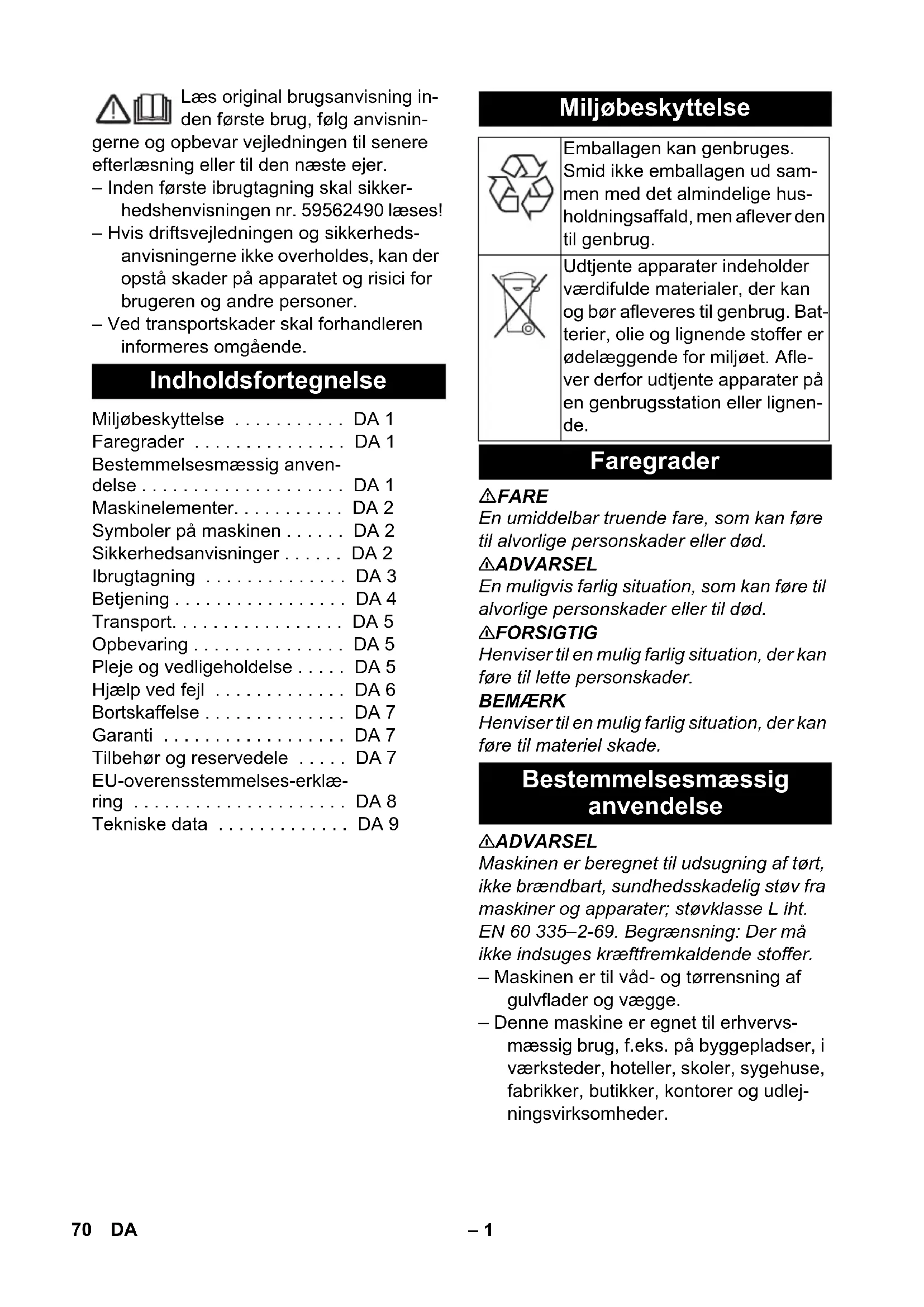 Refª Comprimen- to do cabo EU 297.534 7,5 m 69PT– 1 Læs original brugsanvisning in- den første brug, følg anvisnin- gerne og opbevar vejledningen til senere efterlæsning eller til den næste ejer. – Inden første ibrugtagning skal sikker- hedshenvisningen nr. 59562490 læses! – Hvis driftsvejledningen og sikkerheds- anvisningerne ikke overholdes, kan der opstå skader på apparatet og risici for brugeren og andre personer. – Ved transportskader skal forhandleren informeres omgående. FARE En umiddelbar truende fare, som kan føre til alvorlige personskader eller død. 몇 ADVARSEL En muligvis farlig situation, som kan føre til alvorlige personskader eller til død. 몇 FORSIGTIG Henviser til en mulig farlig situation, der kan føre til lette personskader. BEMÆRK Henviser til en mulig farlig situation, der kan føre til materiel skade. 몇 ADVARSEL Maskinen er beregnet til udsugning af tørt, ikke brændbart, sundhedsskadelig støv fra maskiner og apparater; støvklasse L iht. EN 60 335–2-69. Begrænsning: Der må ikke indsuges kræftfremkaldende stoffer. – Maskinen er til våd- og tørrensning af gulvflader og vægge. – Denne maskine er egnet til erhvervs- mæssig brug, f.eks. på byggepladser, i værksteder, hoteller, skoler, sygehuse, fabrikker, butikker, kontorer og udlej- ningsvirksomheder. Indholdsfortegnelse Miljøbeskyttelse . . . . . . . . . . . DA 1 Faregrader . . . . . . . . . . . . . . . DA 1 Bestemmelsesmæssig anven- delse . . . . . . . . . . . . . . . . . . . . DA 1 Maskinelementer. . . . . . . . . . . DA 2 Symboler på maskinen . . . . . . DA 2 Sikkerhedsanvisninger . . . . . . DA 2 Ibrugtagning . . . . . . . . . . . . . . DA 3 Betjening . . . . . . . . . . . . . . . . . DA 4 Transport. . . . . . . . . . . . . . . . . DA 5 Opbevaring . . . . . . . . . . . . . . . DA 5 Pleje og vedligeholdelse . . . . . DA 5 Hjælp ved fejl . . . . . . . . . . . . . DA 6 Bortskaffelse . . . . . . . . . . . . . . DA 7 Garanti . . . . . . . . . . . . . . . . . . DA 7 Tilbehør og reservedele . . . . . DA 7 EU-overensstemmelses-erklæ- ring . . . . . . . . . . . . . . . . . . . . . DA 8 Tekniske data . . . . . . . . . . . . . DA 9 Miljøbeskyttelse Emballagen kan genbruges. Smid ikke emballagen ud sam- men med det almindelige hus- holdningsaffald, men aflever den til genbrug. Udtjente apparater indeholder værdifulde materialer, der kan og bør afleveres til genbrug. Bat- terier, olie og lignende stoffer er ødelæggende for miljøet. Afle- ver derfor udtjente apparater på en genbrugsstation eller lignen- de. Faregrader Bestemmelsesmæssig anvendelse 70 DA– 2 1 Elektroder 2 Sugeslange 3 Kabelkrog 4 Luftudtag, arbejdsluft 5 Sugehovedets låsemekanisme 6 Universaladapter 7 Luftindtag, motor-køleluft 8 Snavsbeholder 9 Sugehoved 10 Styringsrulle 11 Sugestuds 12 Gulvdyse (ikke inkluderet i leveringen) 13 Sugerør (ikke inkluderet i leveringen) 14 Bæregreb 15 Filterdæksel 16 Rørbøjning (ikke inkluderet i leverin- gen) 17 Sugeeffektregulering (trinløs) 18 Drejeregulator til sugeeffekt (min-max) 19 Kontrollampe 20 Stikkontakt 21 Automatisk filterrensning 22 Hovedafbryder 23 Fladt foldefilter 24 Rengøring af filter 25 Holder til gulvdyse 26 Holder til fugedysen 27 Holder til sugerør 28 Netkabel 29 Typeskilt 몇 ADVARSEL – Hvis returluften føres tilbage i rummet, skal der være en tilstrækkelig høj luft- skifterate L i lokalet. For at overholde de påkrævede grænseværdier, må den til- bageførte volumenstrøm max.. udgøre 50 % af friskluftvolumenstrømmen (rumvolumen V