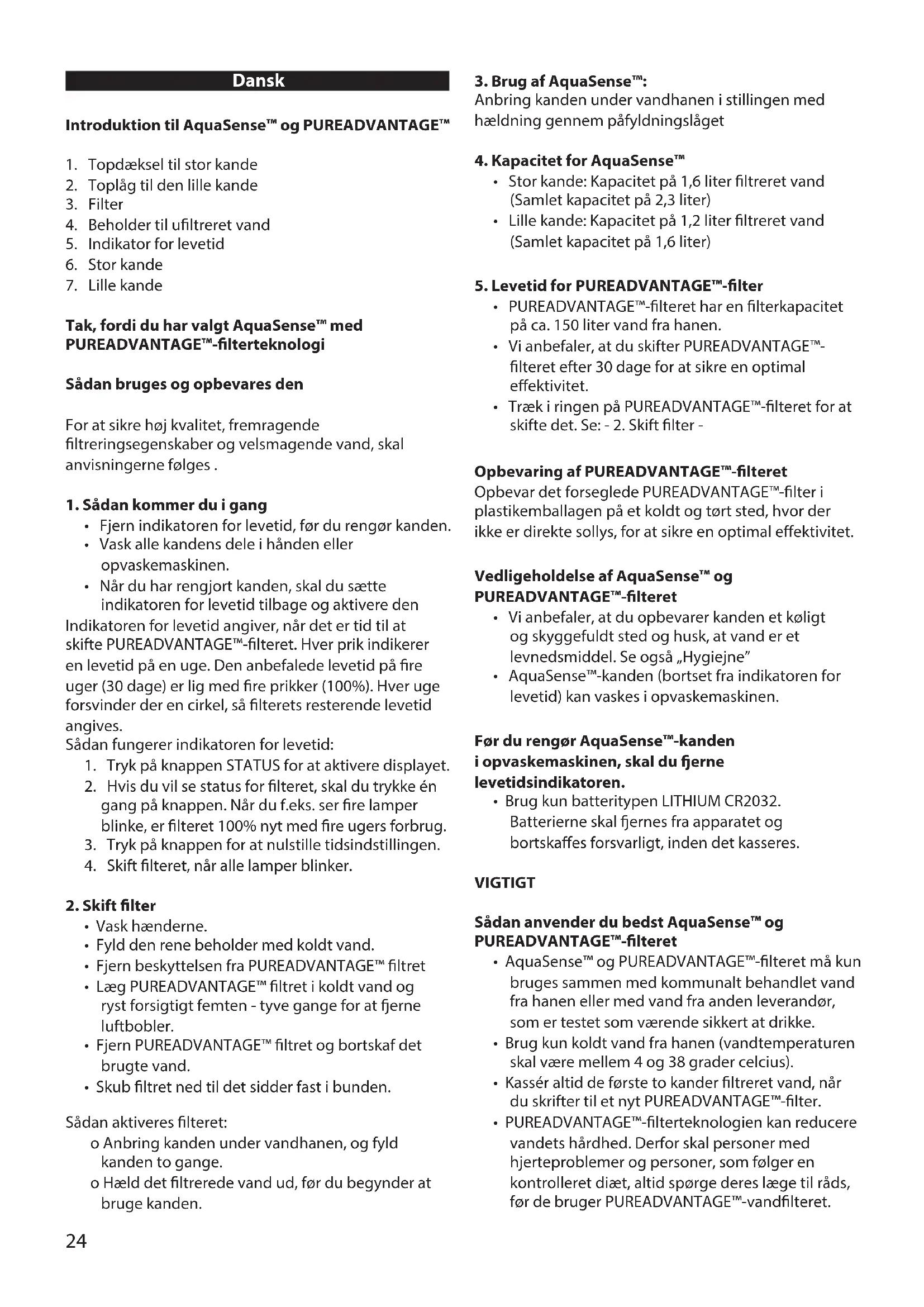 - Brug kun batteritypen LITHIUM CR2032. Batterierne skal ernes fra apparatet og bortskaes forsvarligt, inden det kasseres. VIGTIGT Sådan anvender du bedst AquaSense™ og PUREADVANTAGE™-lteret