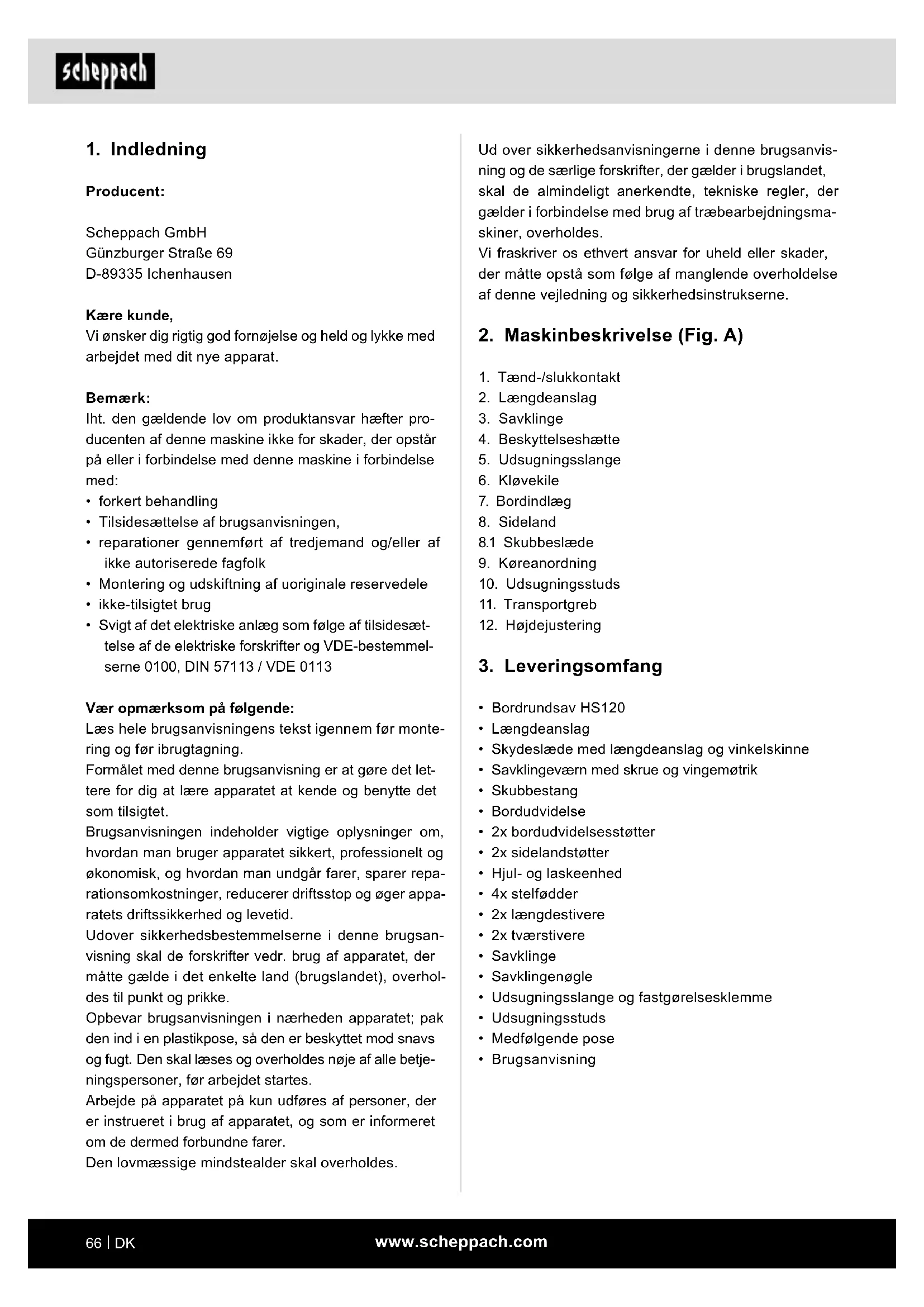 Producent: Scheppach GmbH Günzburger Straße 69 D-89335 Ichenhausen Kære kunde, Vi ønsker dig rigtig god fornøjelse og held og lykke med arbejdet med dit nye apparat. Bemærk: Iht. den gældende lov om produktansvar hæfter pro- ducenten af denne maskine ikke for skader, der opstår på eller i forbindelse med denne maskine i forbindelse med:
