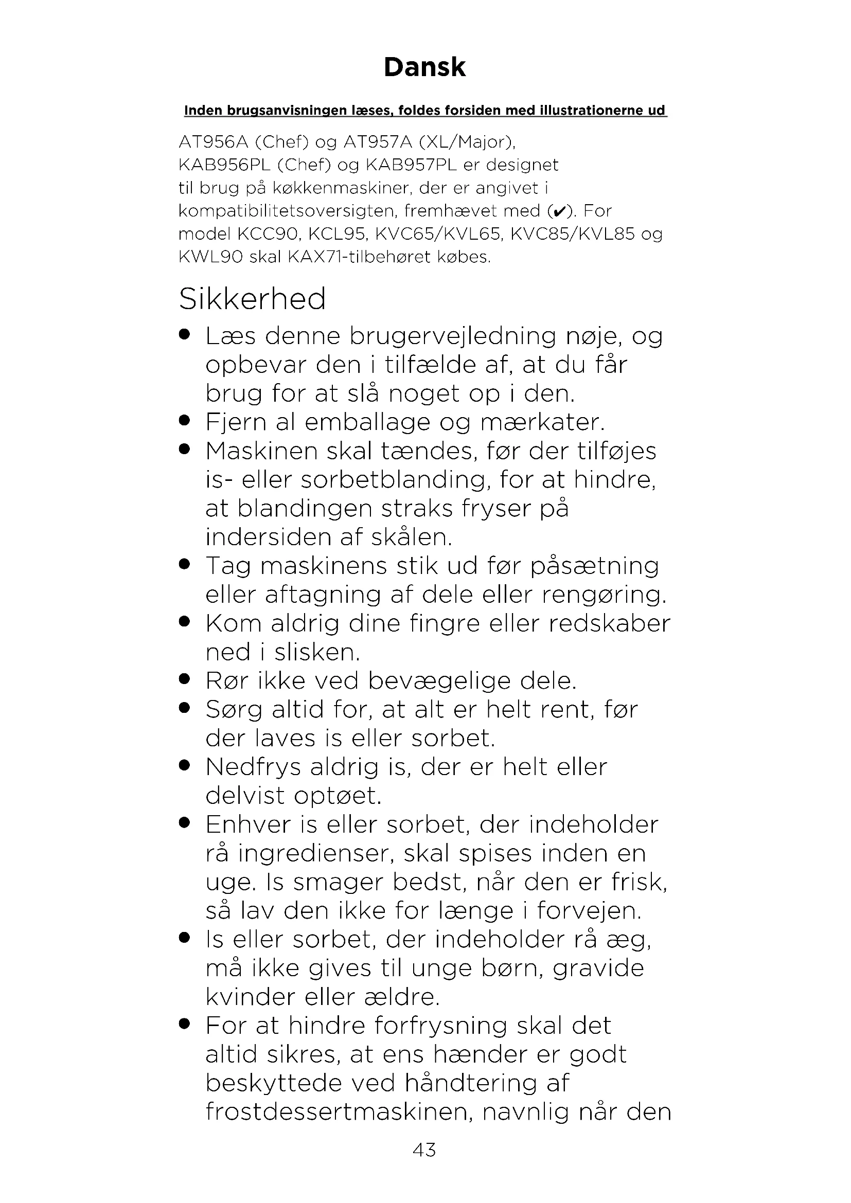 OM AFFALD AF ELEKTRISK OG ELEKTRONISK UDSTYR (WEEE) Ved afslutningen af dets produktive liv må produktet ikke bortskaffes som almindeligt affald. Det bør afleveres på et specialiseret lokalt genbrugscenter eller til en forhandler, der yder denne service. At bortskaffe et elektrisk husholdningsapparat separat gør det muligt at undgå eventuelle negative konsekvenser for miljø og helbred på grund af uhensigtsmæssig bortskaffelse, og det giver mulighed for at genbruge de materialer det består af, og dermed opnå en betydelig energi- og ressourcebesparelse. Som en påmindelse om nødvendigheden af at bortskaffe elektriske husholdningsapparater separat, er produktet mærket med en mobil affaldsbeholder med et kryds.47 48 Opskriftsforslag Herunder er nogle få opskriftsforslag til at hjælpe dig med at lære din frostdessertmaskine at kende. Vaniljeis 500 ml sødmælk 125 ml kaffefløde 5 ml/1 tsk. vaniljeessens 3 æggeblommer 150 g strøsukker 1 Kom fløden, mælken og vaniljeessensen i en gryde, og varm det op næsten til kogepunktet. Sæt det til side for at køle lidt af. 2 I en stor skål piskes samtidig æggeblommerne og sukkeret sammen, indtil det er tykt og har en bleg farve. 3 Rør kontinuerligt, og hæld mælke/flødeblandingen over det piskede æg og sukker. Sørg for, at sukkeret er helt opløst. 4 Hæld blandingen tilbage i gryden ved meget lav varme, og rør fortsat, til blandingen dækker bagsiden af skeen. 5 Lad blandingen køle helt ned. 6 Hæld blandingen i frostdessert-maskinen, og bland, til den er fast (ca. 30 min.). Variationer: Chokolade – udelad fløden, og tilsæt i stedet 100 g ren chokolade, der er blevet smeltet i en beholder over en gryde med kogende vand. Nødder – tilføj 100 g hakkede nødder til isblandingen lige før servering. Jordbæris 400 g modne jordbær 200 ml piskefløde 75 g strøsukker Saften af en ½ citron 1 Purer jordbærrene. 2 Bland sukkeret, fløden og citronsaften i pureen. 3 Sæt blandingen i køleskabet for at køle af. 4 Når blandingen er afkølet, hældes den i frostdessertmaskinen og blandes, til den er fast. Variationer: Al bærfrugt kan bruges i stedet for jordbærrene. Sukkerindholdet i blandingen afhænger af den anvendte frugt, så husk at kontrollere sødmen før frysning.47 48 AT956A (Chef) och AT957A (XL/Major), KAB956PL (Chef) och KAB957PL har designats för användning med de köksapparater som listas i kompatibilitetsdiagrammet och som är markerade med ( ✔). För modellerna TYP KCC90, KCL95, KVC65/KVL65, KVC85/KVL85 och KWL90 måste du köpa ett KAX71-tillbehör. Säkerhet