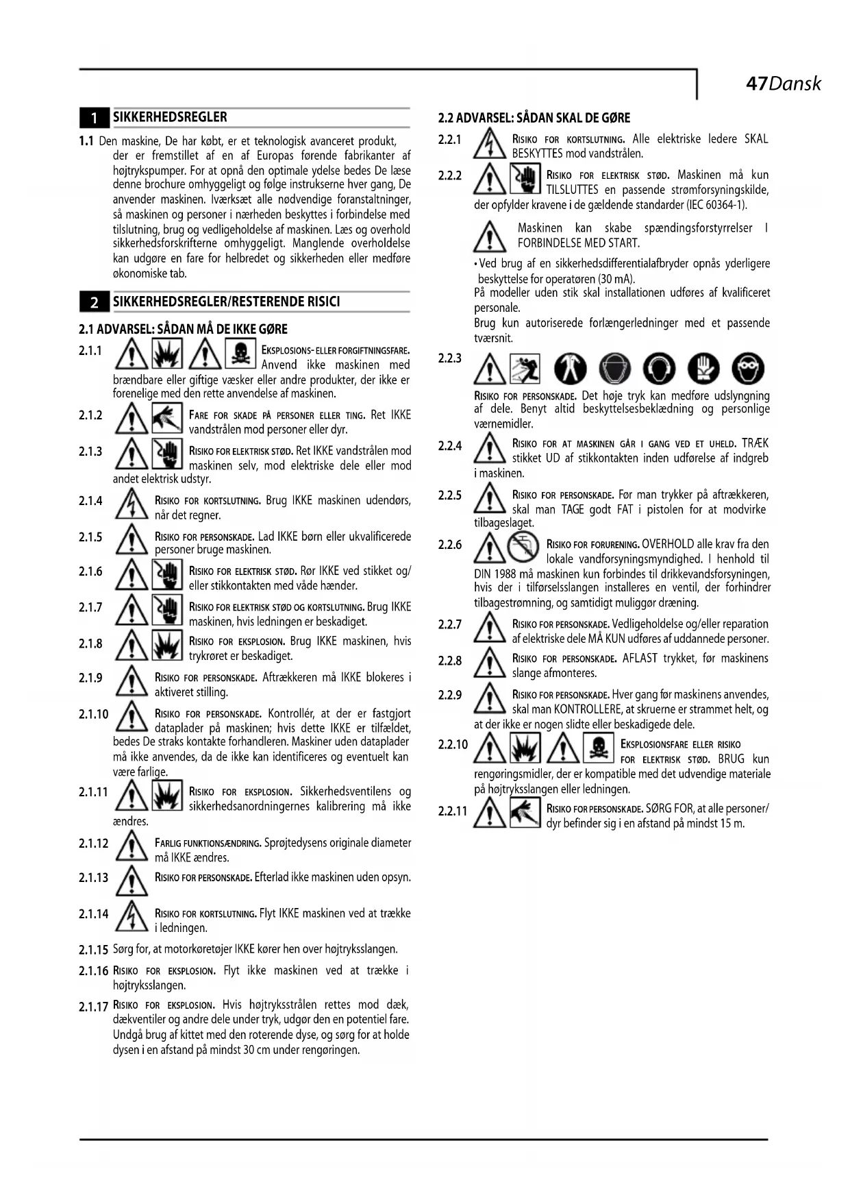 der er fremstillet af en af Europas førende fabrikanter af højtrykspumper. For at opnå den optimale ydelse bedes De læse denne brochure omhyggeligt og følge instrukserne hver gang, De anvender maskinen. Iværksæt alle nødvendige foranstaltninger, så maskinen og personer i nærheden beskyttes i forbindelse med tilslutning, brug og vedligeholdelse af maskinen. Læs og overhold sikkerhedsforskrifterne omhyggeligt. Manglende overholdelse kan udgøre en fare for helbredet og sikkerheden eller medføre økonomiske tab.