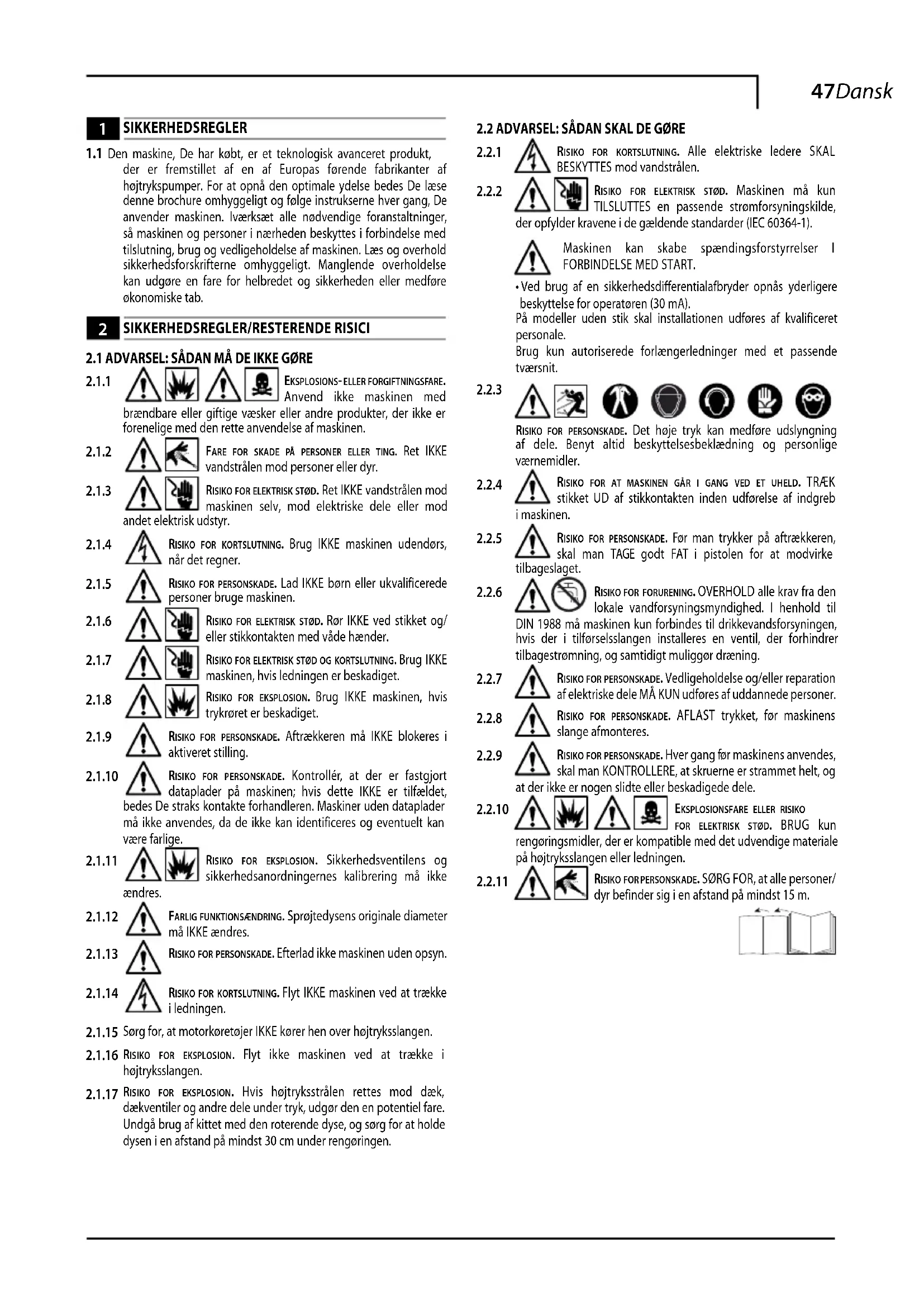 der er fremstillet af en af Europas førende fabrikanter af højtrykspumper. For at opnå den optimale ydelse bedes De læse denne brochure omhyggeligt og følge instrukserne hver gang, De anvender maskinen. Iværksæt alle nødvendige foranstaltninger, så maskinen og personer i nærheden beskyttes i forbindelse med tilslutning, brug og vedligeholdelse af maskinen. Læs og overhold sikkerhedsforskrifterne omhyggeligt. Manglende overholdelse kan udgøre en fare for helbredet og sikkerheden eller medføre økonomiske tab.